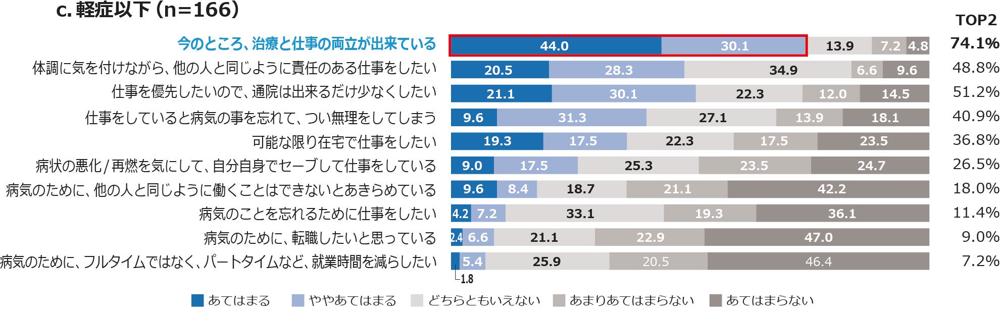 軽症以下の患者さんでは、7割以上(74.1%)が治療と仕事の両立ができていると回答しています【図5-c】が、中等症以上では約半数(53.1%)にとどまりました【図5-b】。また中等症以上の34.4%(11/32)が、「他の人と同じように働くことはできないと諦めて」おり、31.2%(10/32)が「病状の悪化や再燃を気にして自分自身でセーブして仕事をしている」ことも分かりました【図5-b】。