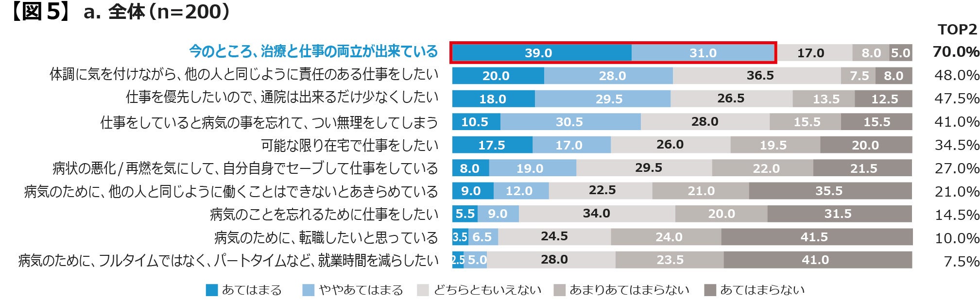 ■ 「今のところ、治療と仕事の両立ができている」という項目に対して「あてはまる」「やや当てはまる」と回答した患者さんは、全体では70.0%(140/200)で、軽症以下では74.1%(123/166)だったが、中等症以上では53.1%(17/32)にとどまった。