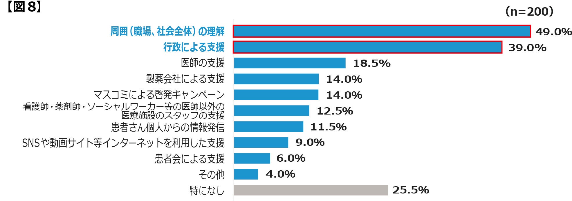患者さんが「自分らしく働く」ために必要と感じていることは「周囲(職場、社会全体)の理解(49.0%)」で最も多く、次いで「行政による支援」(39.0%)でした【図8】。