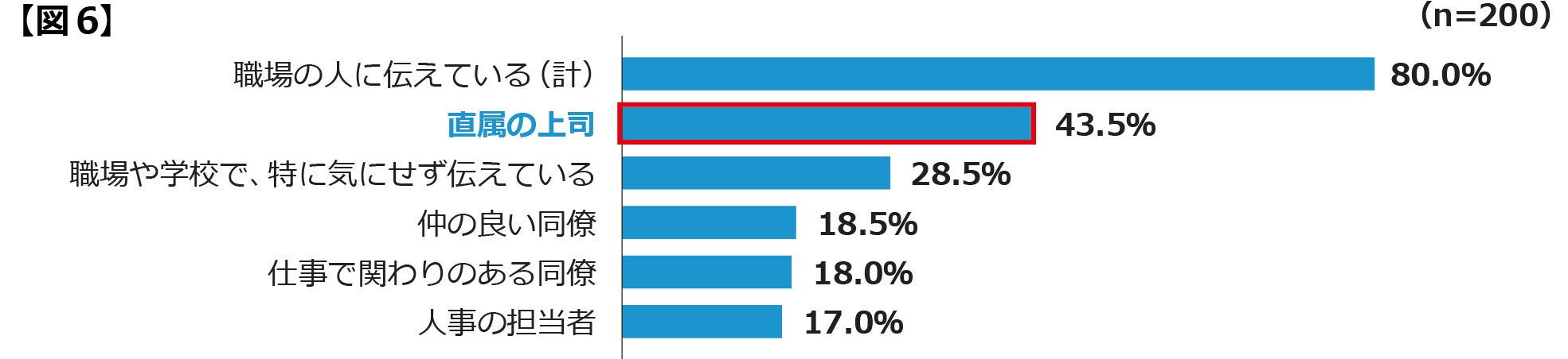 全回答者の8割がIBDであることを職場の誰かには伝えていましたが、直属の上司に伝えていると回答したのは、43.5%でした【図6】。