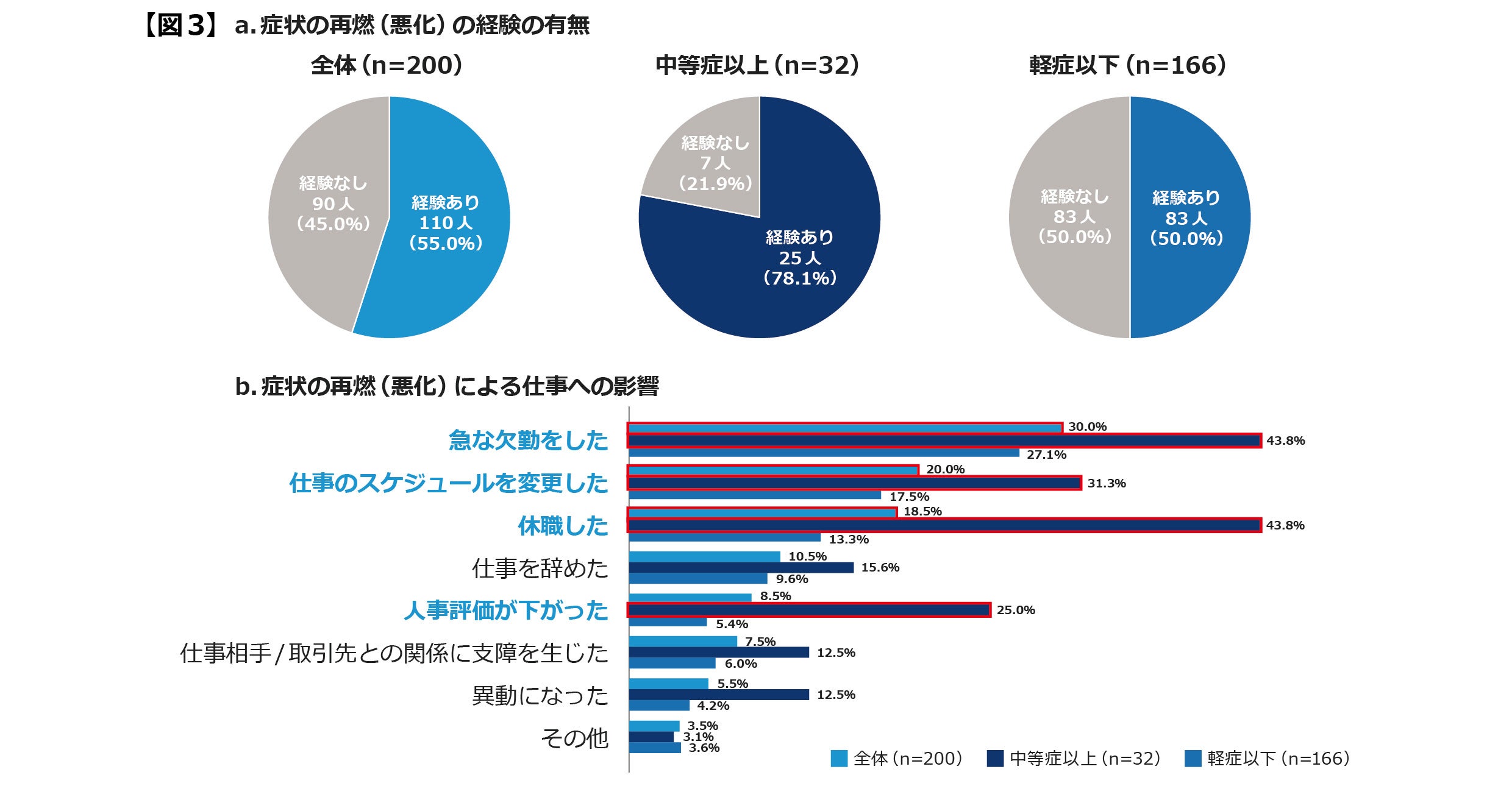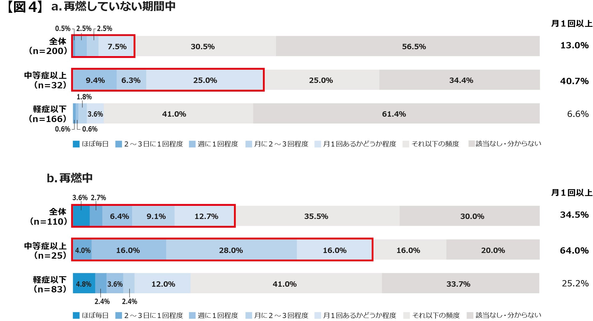 ■ 全体のうち半数以上の患者さん(55.0%、110/200)が再燃を経験しており、特に中等症以上では約8割(78.1%、25/32)が経験していると回答【図3-a】。