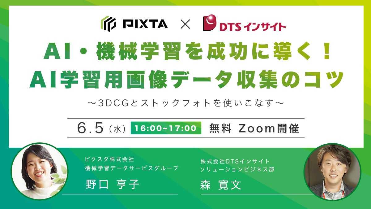 ピクスタ株式会社(東京都渋谷区 代表取締役社長:古俣大介、東証グロース:3416)が運営する写真・イラスト・動画・音楽素材のマーケットプレイス「PIXTA(ピクスタ)」( https://pixta.jp)は、「機械学習を成功に導く!AI学習用画像データ収集のコツ」をテーマにしたウェビナーを、6月5日(水)16:00に開催いたします。