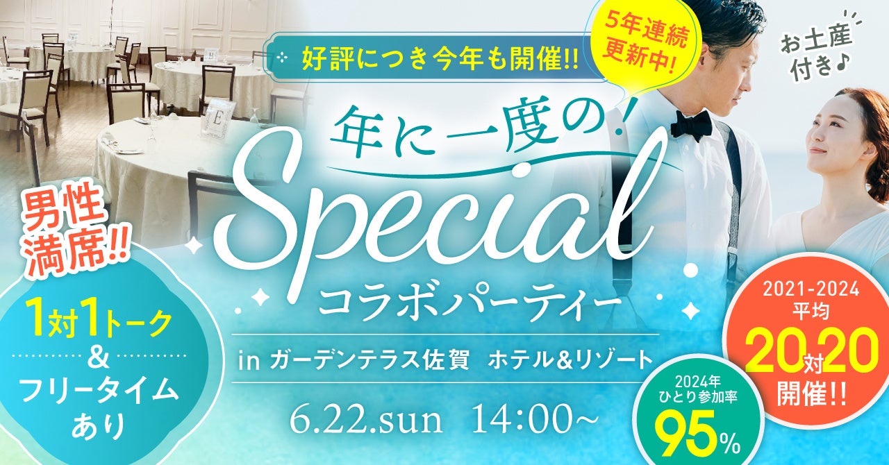 株式会社トータルマリアージュサポートが運営するTMSイベントポータルは、2025年6月22日(日)、ガーデンテラス佐賀ホテル&リゾートにて、5年連続開催中のスペシャル婚活パーティーを開催いたします。