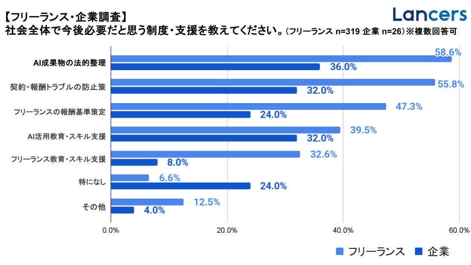 フリーランス・企業の双方で「AI成果物の法的整理」が最も多く挙げられた。次いで「契約・報酬トラブルの防止策」「フリーランスの報酬基準策定」などが挙げられ、取引上の支援体制の整備が求められている。