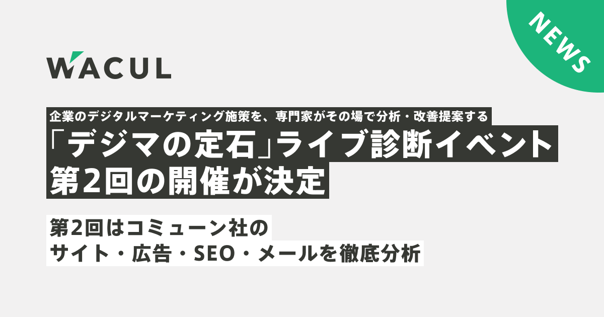 データ分析ツール「AI アナリスト」でマーケティングDX を自動化する株式会社WACUL(読み:ワカル、代表取締役社長:大淵 亮平、証券コード:4173、以下当社)は、企業のデジタルマーケティング施策を専門家が診断し、リアルタイムに課題や改善点をアドバイスする「デジマの定石」ライブ診断イベントの第2回を2022年6月30日(木)に開催することが決定しました。第2回はコミューン株式会社様をゲストに迎え実施いたします。