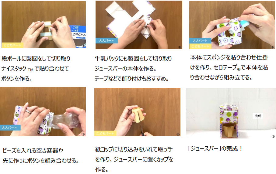 今回はYouTube、Instagramなどで発信されている工作アイデアが人気の工作作家「こども工作」さんに、セロテープ®とナイスタック(TM)を使った工作アイデアを考えていただきました。廃材を活用した「ジュースバー」をご紹介します。