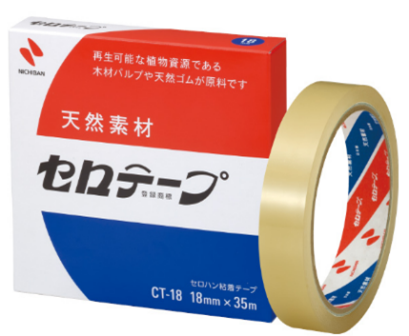 「セロテープ®」は、1948年の発売当初から、原料のほとんどを植物由来の天然素材で製造しています。セロハンは、再生可能な植物資源である樹木(木材パルプ)を原料とした、天然素材のフィルムです。粘着剤の主原料には天然ゴムや天然樹脂を、巻心には再生紙を使用しています。焼却する場合の燃焼カロリーが低く、有毒ガスの発生も少ない、環境に配慮した製品です。