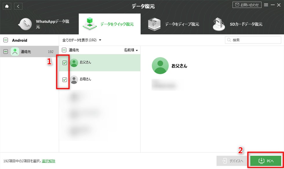 6.復元したい電話帳の項目を選択して、「PCへ」ボタンをクリックします。