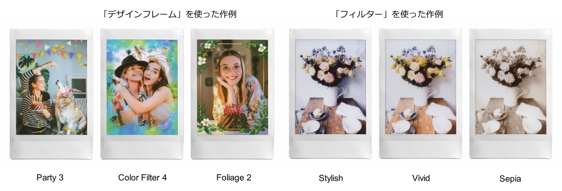 従来の「mini LiPlay」同様、カメラ本体に13種のデザインフレームと6種類のフィルター、専用アプリには60種以上のデザインフレームを搭載。フレームやフィルターで画像にエフェクトをかけて撮影できます。