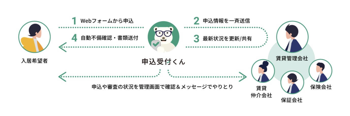 ⼊居希望者がWEB上で⼊⼒した申込に必要な情報や申込⼿続きの進捗を、賃貸不動産管理会社、賃貸 不動産仲介会社、家賃債務保証会社、保険会社などに連携し、申込書提出から審査までのやりとりを効 率化することができる、仲介会社利用率No.1(※1)の不動産関連WEB申込受付システムです。現在、「申込受付くん」による賃貸物件電⼦⼊居申込数は年間約97万件(※4)で、約2,200社で導⼊(※5)国内約70社の保証会社と連携(※6)し ています。
