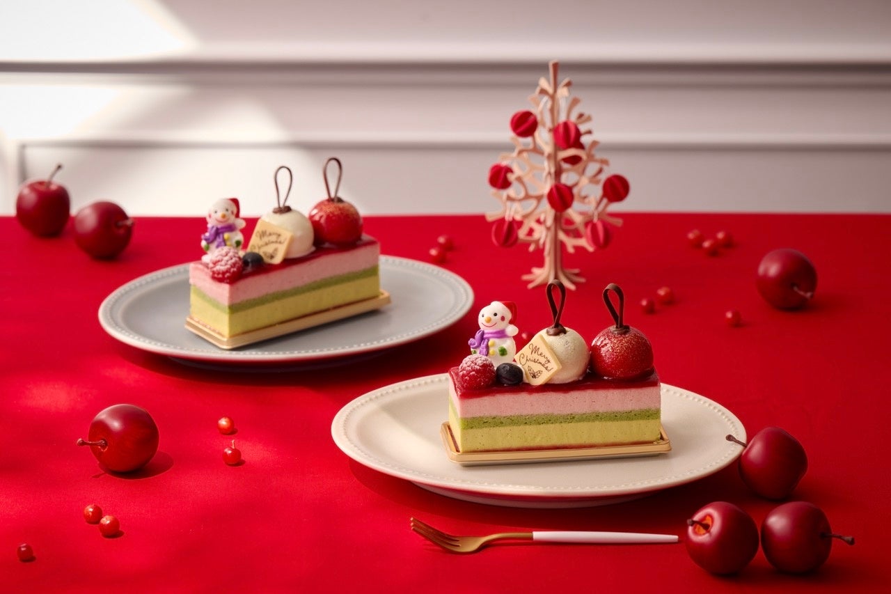 クリスマスカラーをまとった色鮮やかなムースケーキです。いちごとピスタチオのムースを重ね、トップにはクリスマスツリーのオーナメント“クーゲル”をモチーフにしたムースを2つ並べました。ホリデームード溢れるスイーツです。