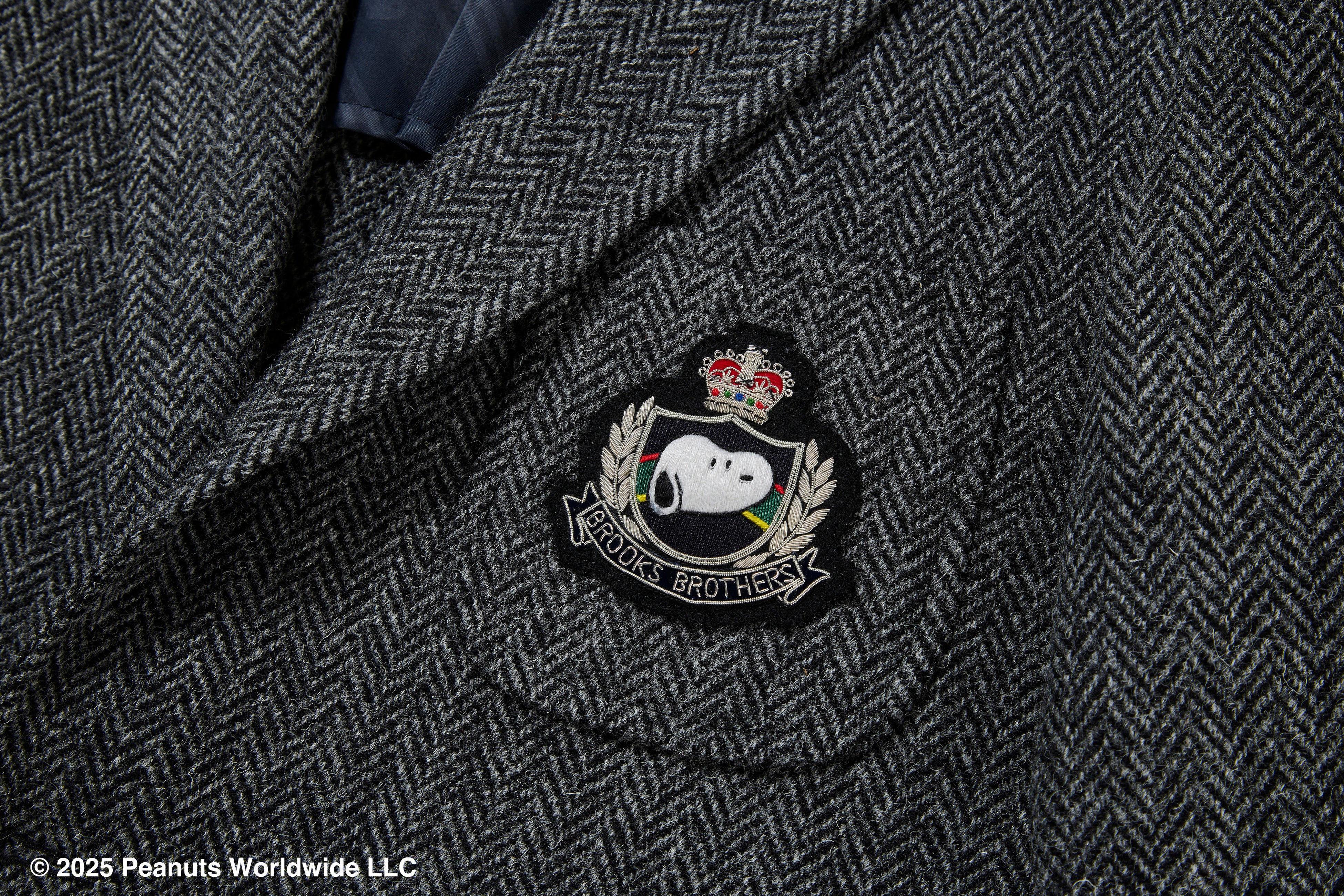 ハリスツイード社製の上質なヘリンボーン生地を使用し、ブルックス ブラザーズの代名詞である3ボタン段返りのトラディショナルフィットで仕立てました。胸元には今回のコラボレーションを象徴するスヌーピーのエンブレムを配置。裏地にはブランドを代表するBB #1ストライプとスヌーピーのモチーフを組み合わせたプリントを採用しました。クラシックなスタイルに遊び心を効かせた、限定感あふれる一着です。