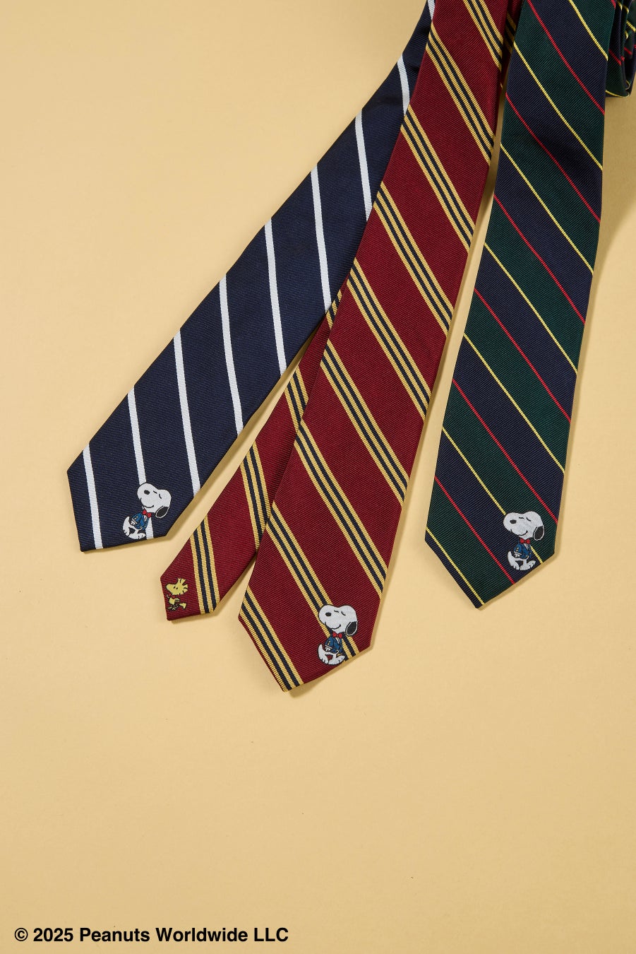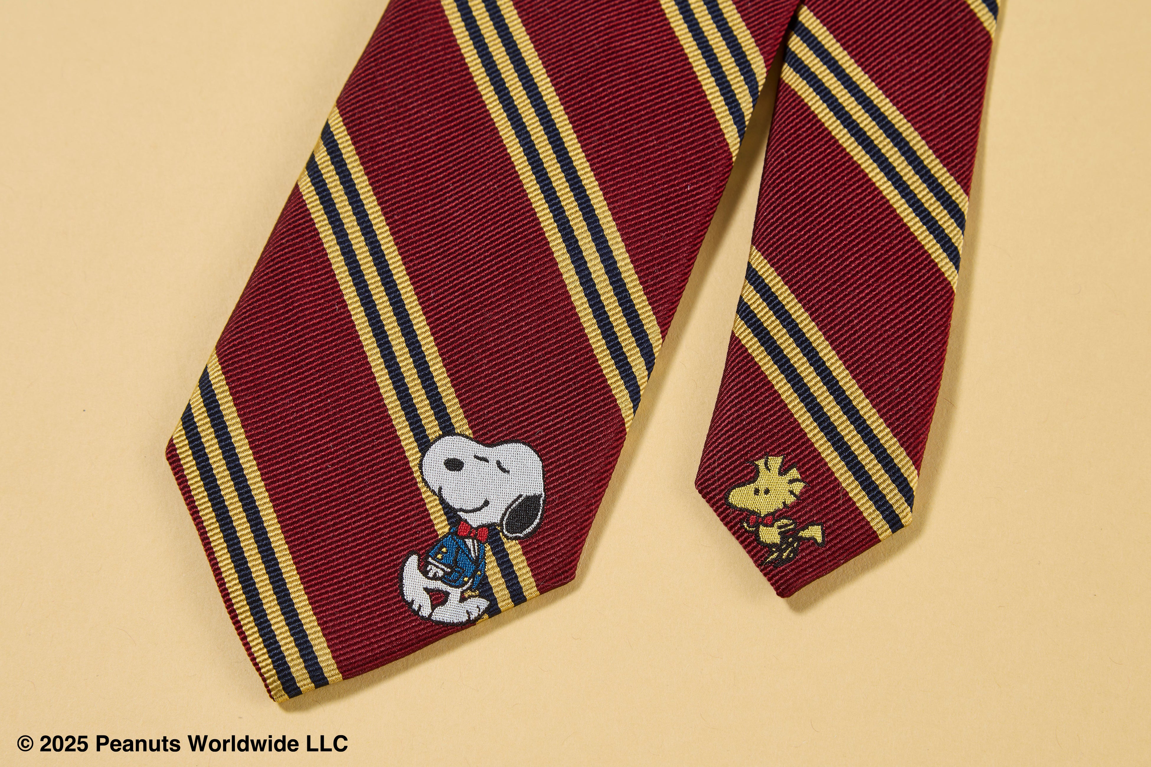 ストライプ(ネイビー)、アーガイルサザーランド(グリーン)をベースに、大剣にスヌーピー、小剣にウッドストックをジャガードで表現しました。タイを締める際にあえて大剣と小剣をずらすと、隠れたキャラクターが覗く仕掛けに。伝統的なスタイルを保ちながら、大人のユーモアを楽しめる一本です。