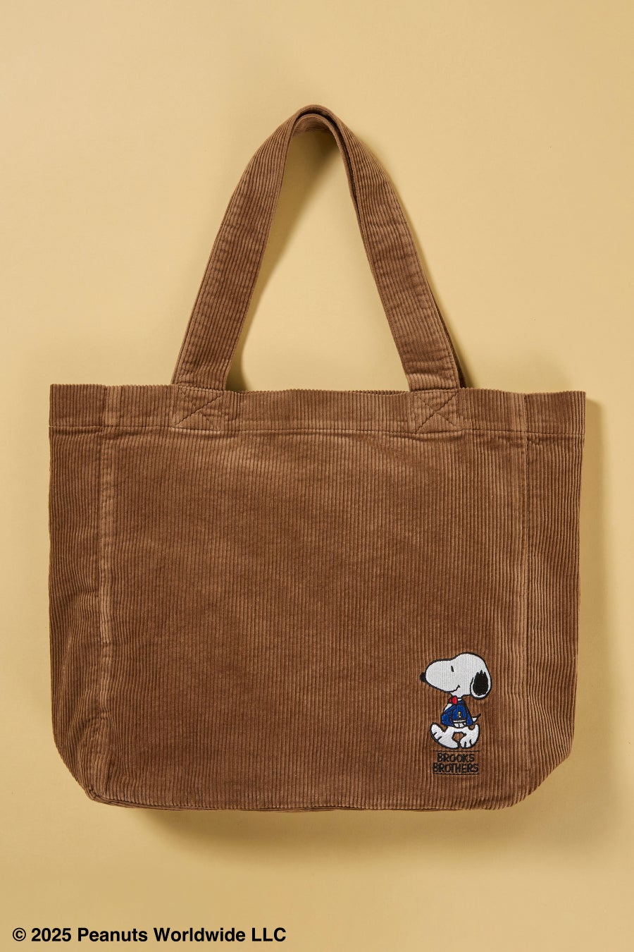 ソフトなコーデュロイで仕立てたトートバッグは、独特のリラックス感がコーディネートのポイントに。ブレザー&ボウタイでドレスアップしたスヌーピーの刺繍ともマッチしています。裏地なしの一枚仕立てで、軽やかに携えられるのも特徴。財布やスマホなどを入れるのに便利な内ポケットと、マイボトルやペットボトルを収納できるボトルホルダーポケットも配しました。