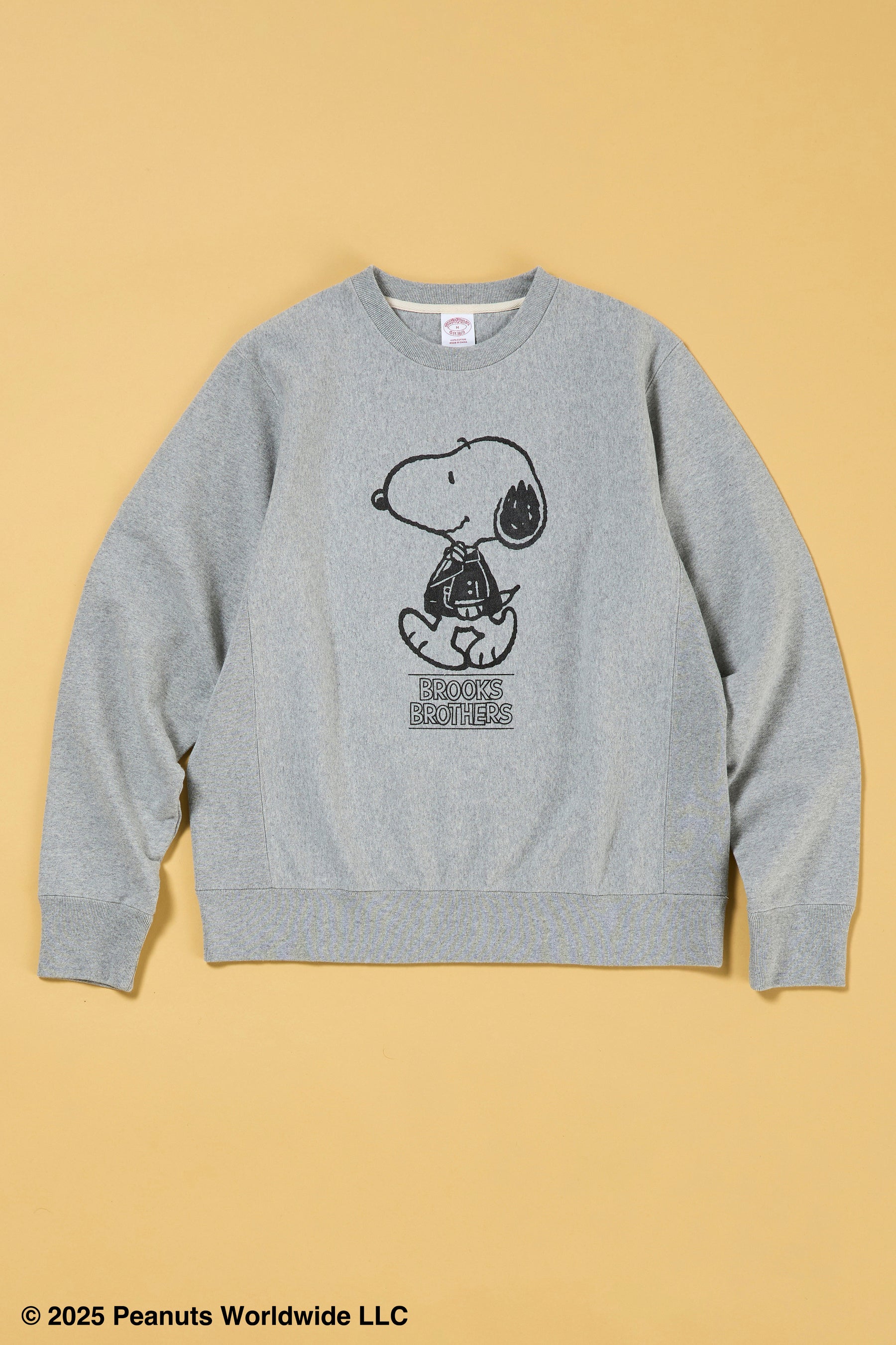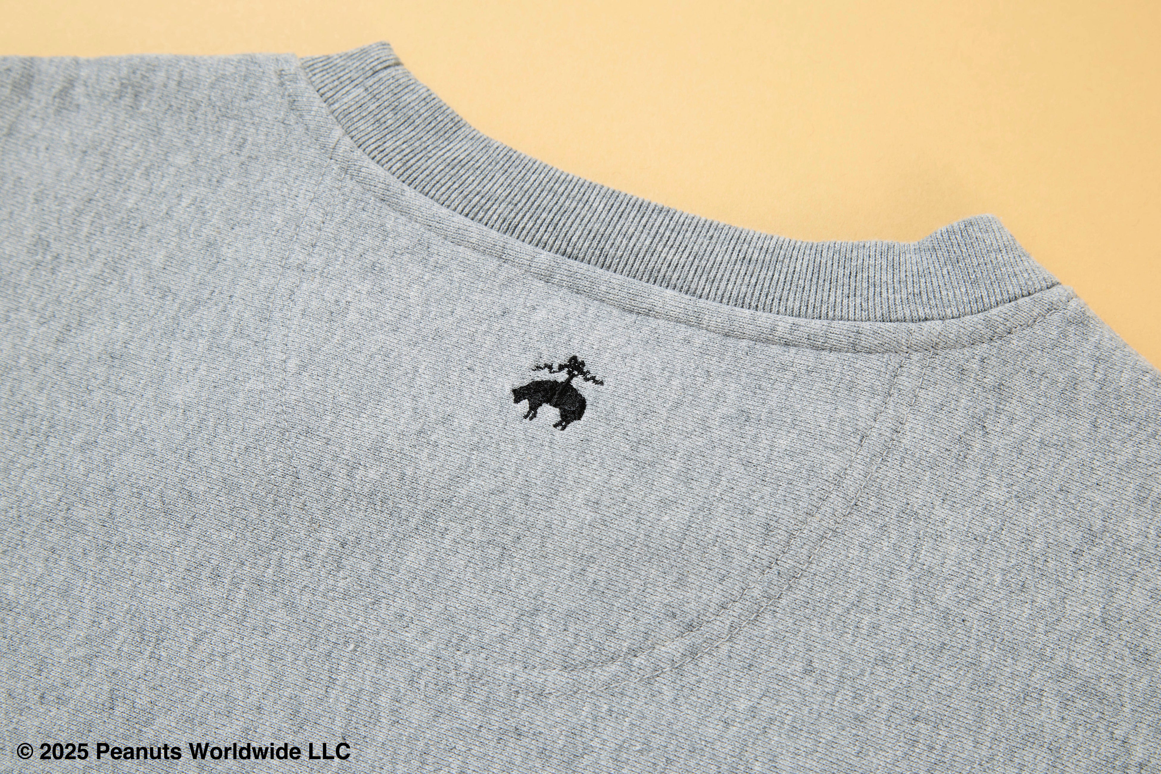 グレーとネイビーの2色展開のクルーネックスウェットシャツは、3ボタン段返りブレザーにガードストライプの蝶ネクタイを身につけたスヌーピーのプリントがポイント。グレーは掠れた質感でヴィンテージ感を演出しました。大きなプリントながらモノトーンのシルクスクリーンを用いることで、落ち着いた印象に。シャツとのレイヤードにも適したユニセックス仕様で、ブランドネームはPEANUTSのロゴと同じフォントを採用した特別デザインです。