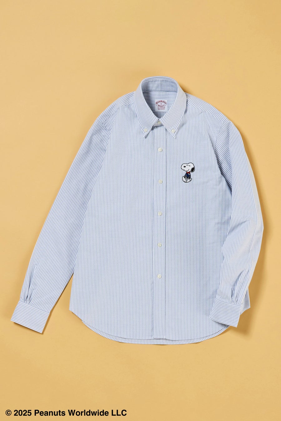 定番の7ボタンのボタンダウンシャツに、3ボタン段返りブレザーと赤いボウタイでおめかしをしたスヌーピーの刺繍をあしらいました。1900年に誕生し、125周年を迎えるボタンダウンシャツは、ブルックス ブラザーズの歴史を語るうえで欠かせない一枚です。