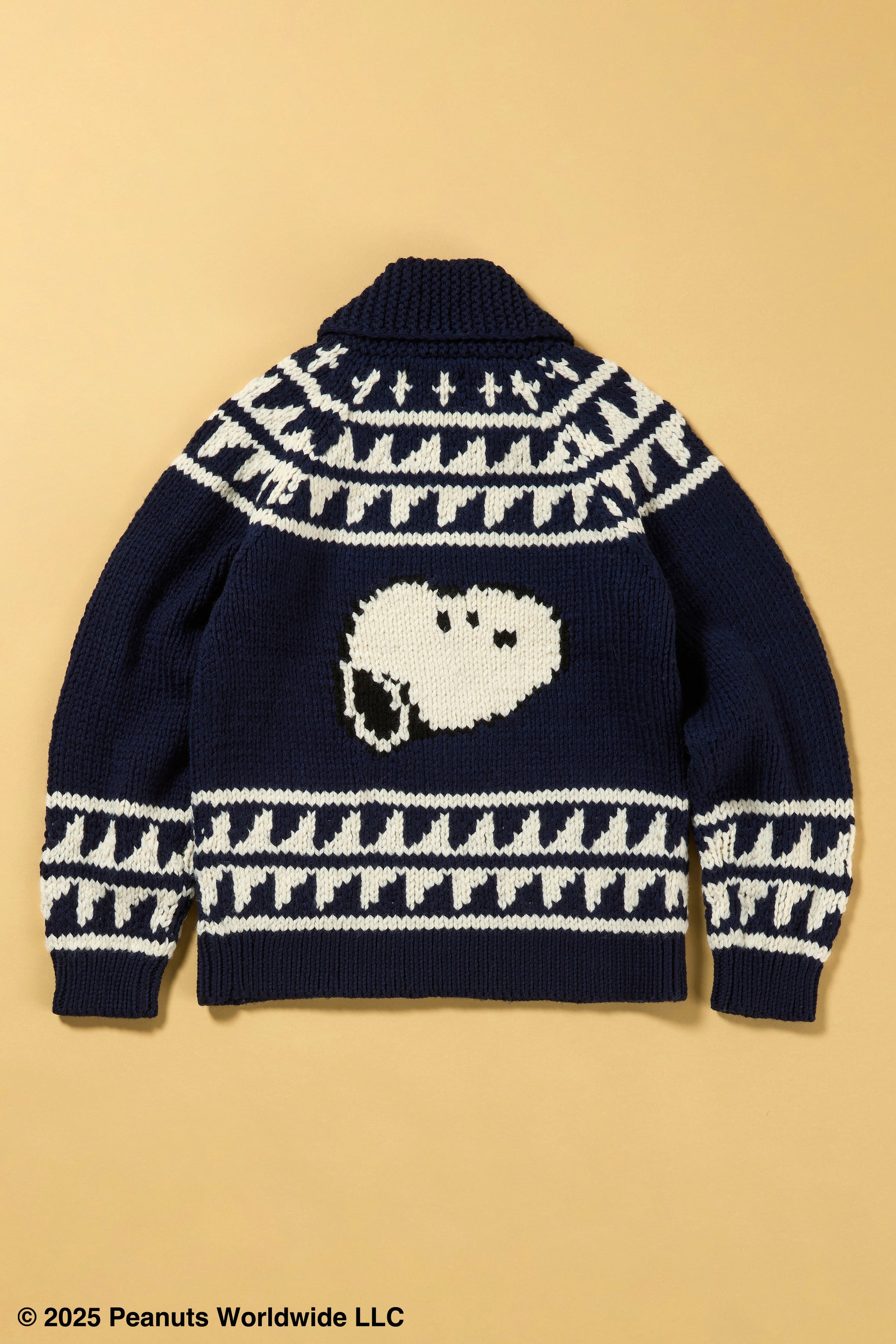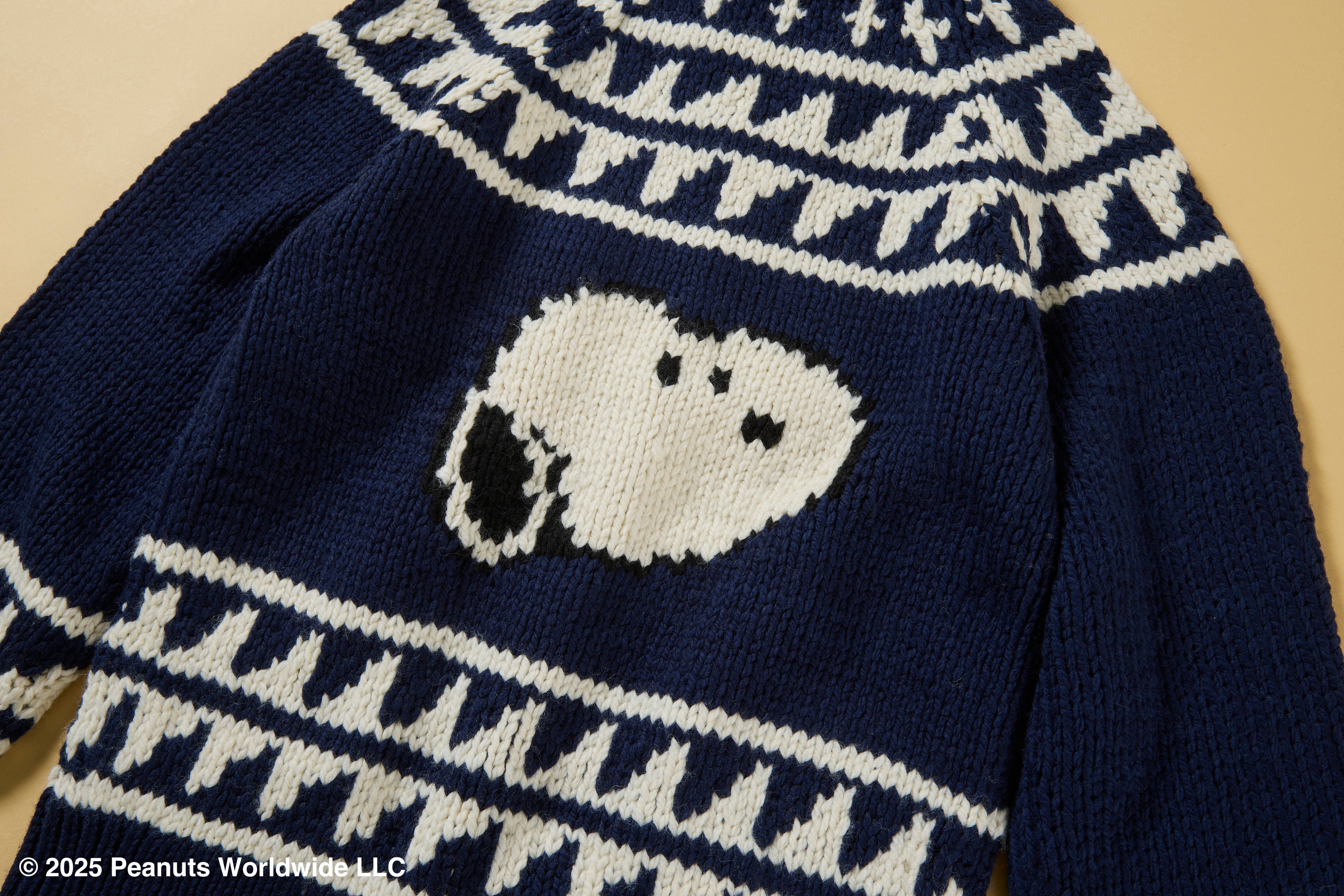 ざっくりとした編み目が魅力のウール100%カウチンニット。フロントにはブランドのシンボルであるゴールデン フリース、バックにはスヌーピーの柄を大きく編み込みました。ネイビー地にホワイトのコントラストで、大人でも着やすい落ち着いた印象に。冬のスタイルに温もりとキャラクター性を添える一枚です。