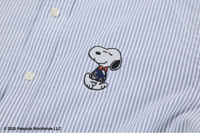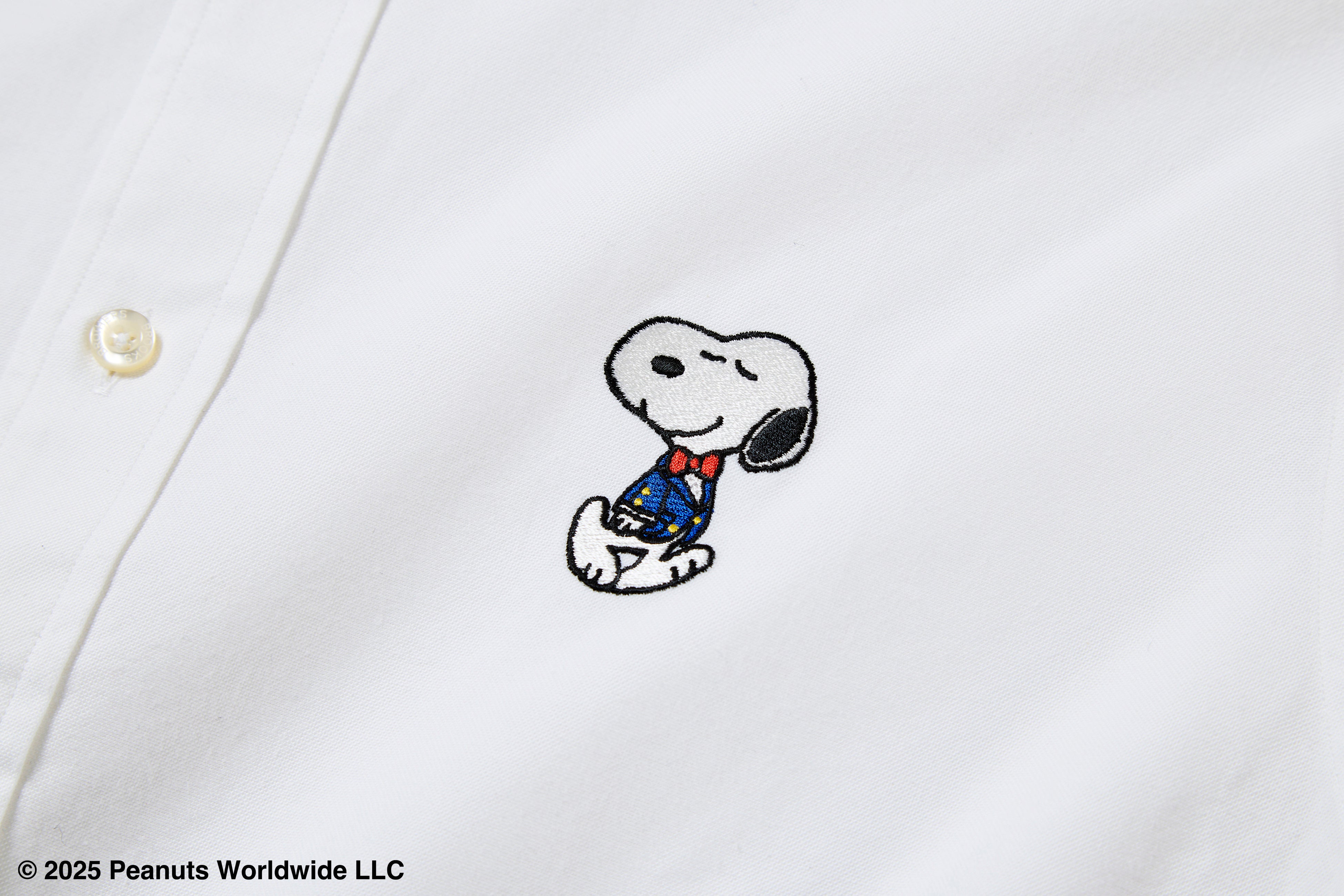 1990年代のUS OXシルエットを再現したウィメンズのボタンダウンシャツ。ストレートでゆったりとしたクラシックフィットやプラケットフロントといったメンズライクな要素を踏襲しながら、女性にフィットする仕立てに。胸元にはブレザーと赤いボウタイでおめかししたスヌーピーの刺繍を施しました。今回のコラボで初となるウィメンズのストライプシャツです。