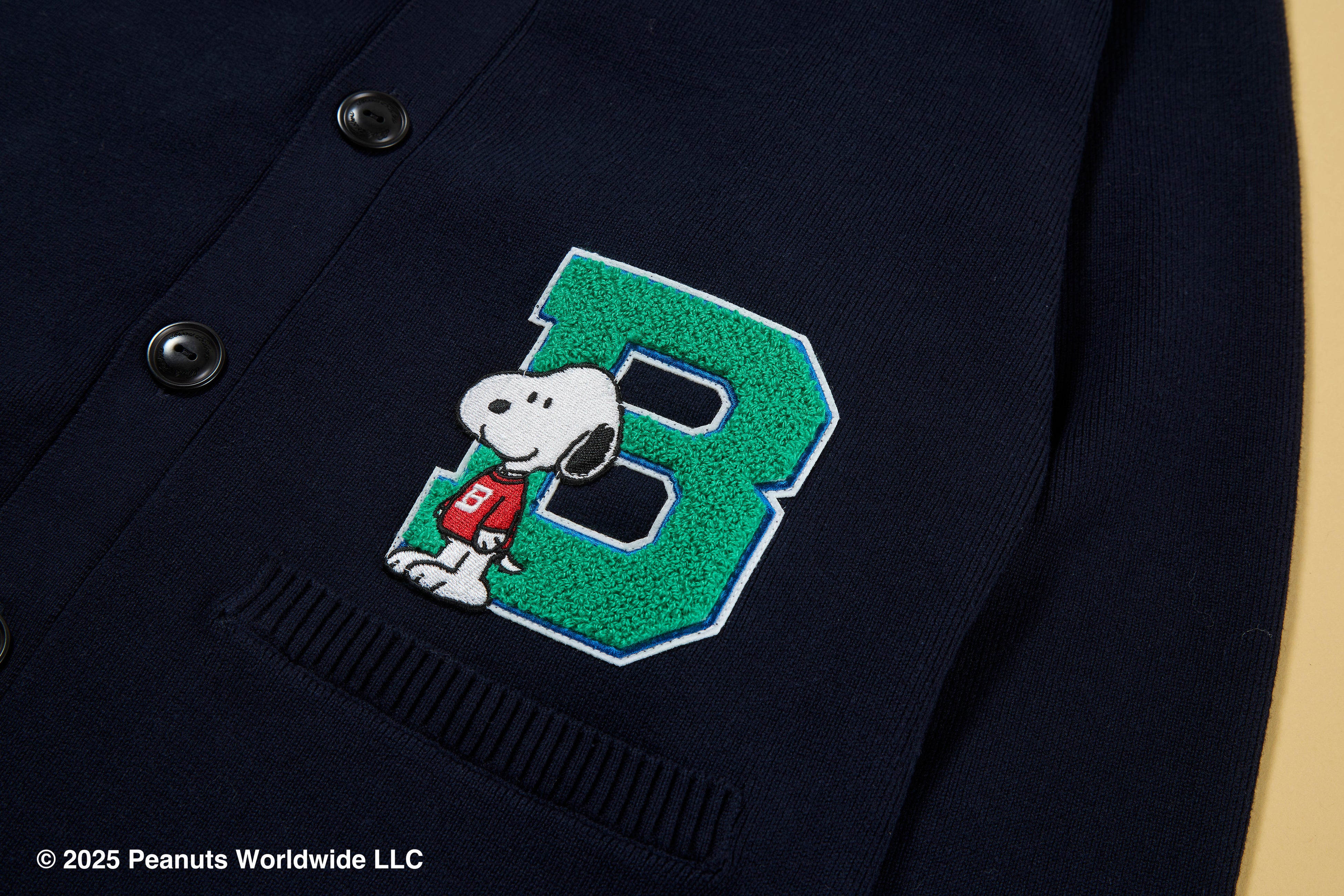 カレッジテイストを取り入れたトラッドカーディガン。リラックスフィットのロングカーディガンは、ユニセックス仕様でメンズも着用可能な男前合わせ。しっかりとしたコットン素材で、シーズンを問わず活躍します。袖と裾に入ったライン入りリブがアクセント。胸元にはブランド頭文字“B”とスヌーピーを組み合わせたワッペンを配置し、カレッジセーターを思わせるクラシックな表情を演出しました。