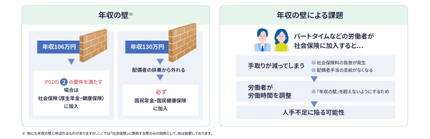 ※1 厚生労働省が新設した「年収の壁・支援強化パッケージ」。106万円の壁についてはキャリアアップ助成金の社会保険適用時処遇改善コース、130万円の壁については事業主の証明によって被扶養者認定を受けられる制度。