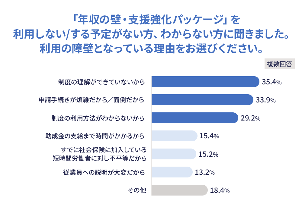 本調査から、中小企業経営者や労務担当者の間では「年収の壁対策」に対する認知が高い一方で、具体的な内容の理解や実際の活用はまだ進んでいないことが示唆されています。利用意向にはばらつきがあり、特に人材確保や従業員モチベーション向上などを期待する声がある一方で、申請手続きの煩雑さや制度理解の不足などの課題が利用の障害として挙げられています。また、調査において具体的なコメントとして、アルバイトの扶養範囲内の調整や人材不足、勤怠管理の複雑化などが浮かび上がりました。このような課題解決には、対策の具体的な周知などが必要とされます。