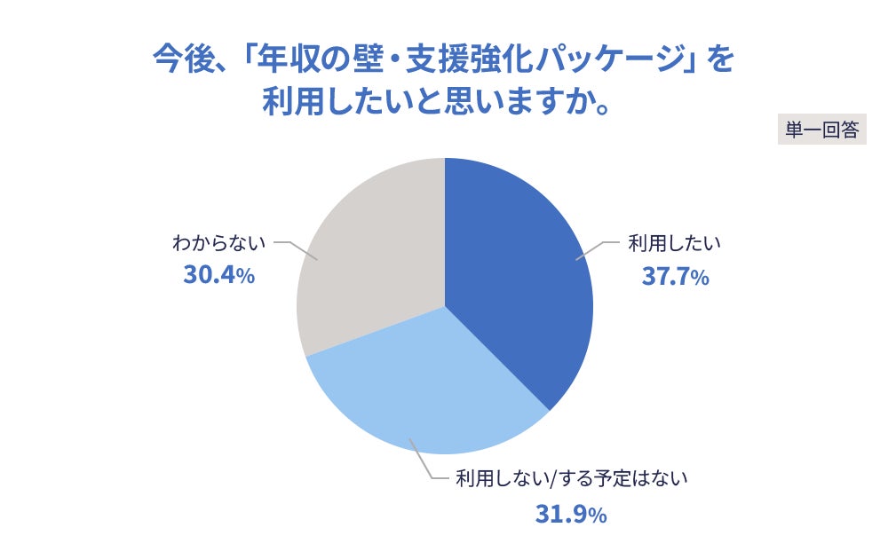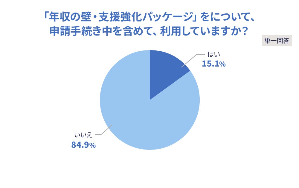 「年収の壁」対策について認知している人のうち、実際に利用している、また申請手続き中の回答者は15.1%と留まりました。