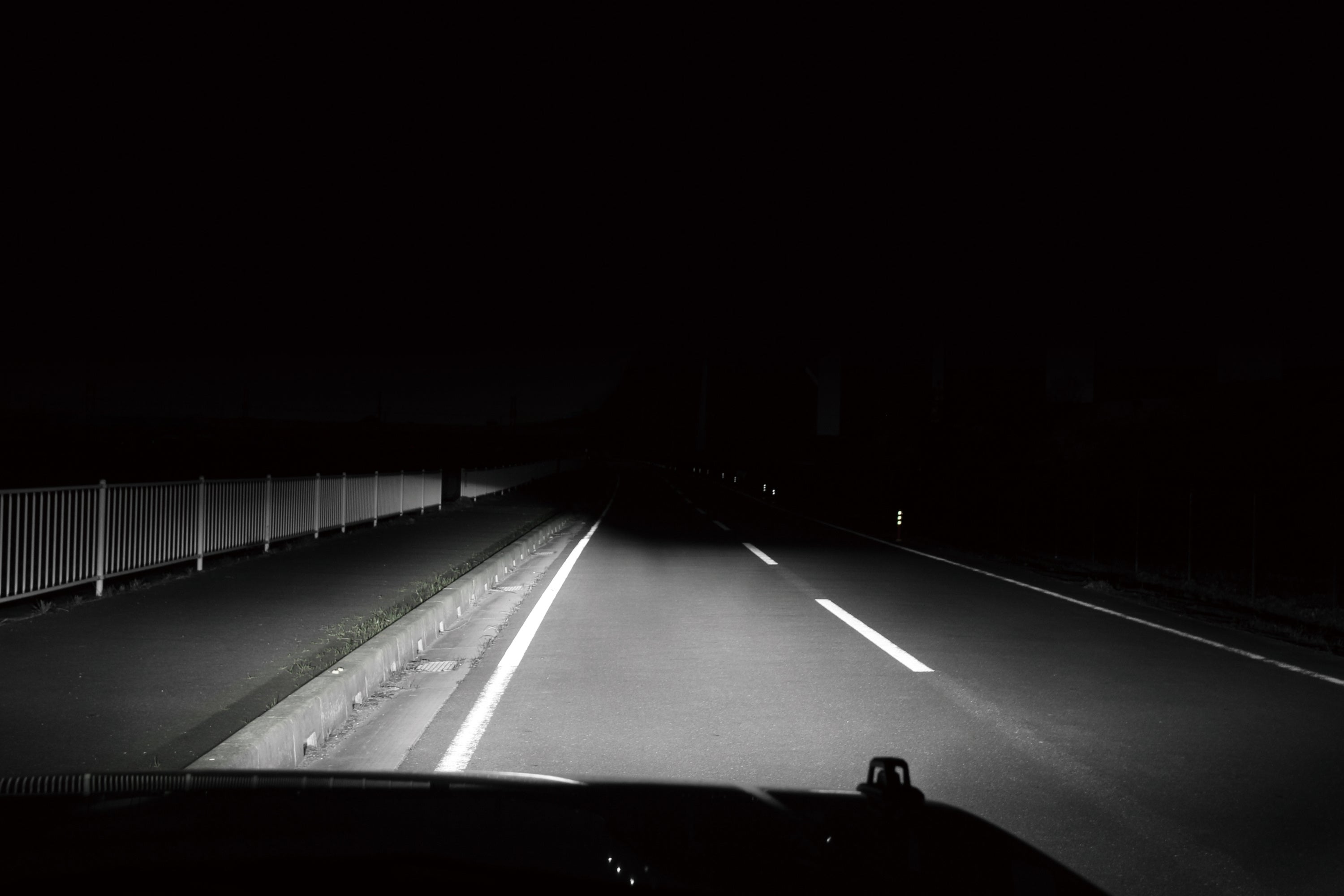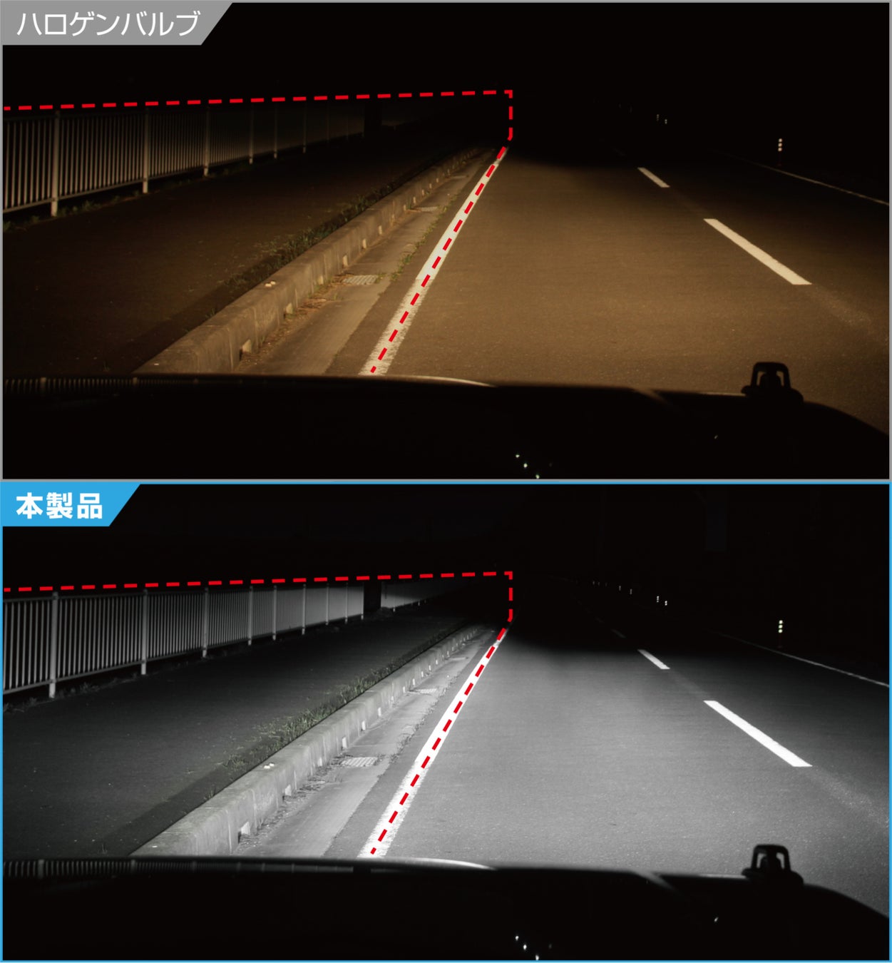 ハロゲンバルブ同等のカットオフラインで対向車への眩しさを抑制しつつ、明るさを確保(下画像:右) -