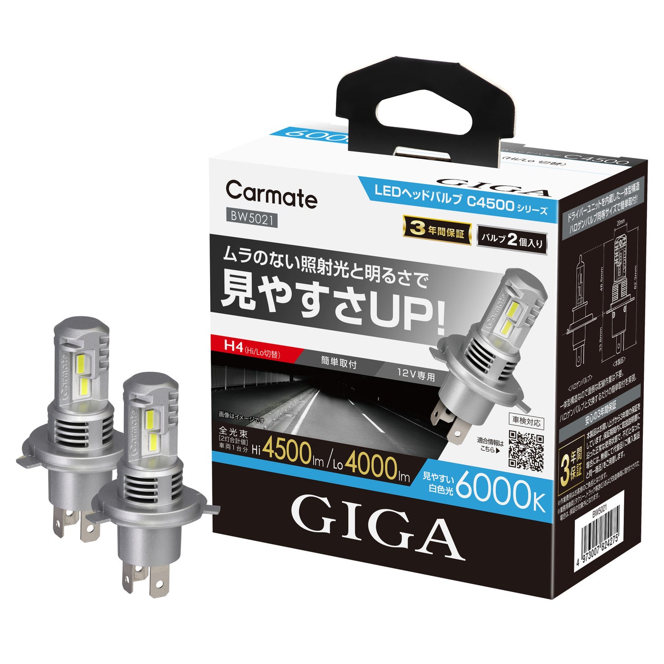 同日、GIGA LEDヘッド&フォグバルブの新たなエントリーモデル「GIGA LEDヘッドバルブ C4500(以下、C4500)」シリーズも発売。「C4500」は、ドライバーユニット一体型で手軽にLED化が可能な「C3600」シリーズのリニューアルモデルであり、部品レイアウトの見直しにより放熱性能を向上。さらにLEDの変更により、ハロゲンバルブ比約2倍、従来比では1.25倍(※2)の明るさを実現しました。各製品の詳細は以下をご覧ください。