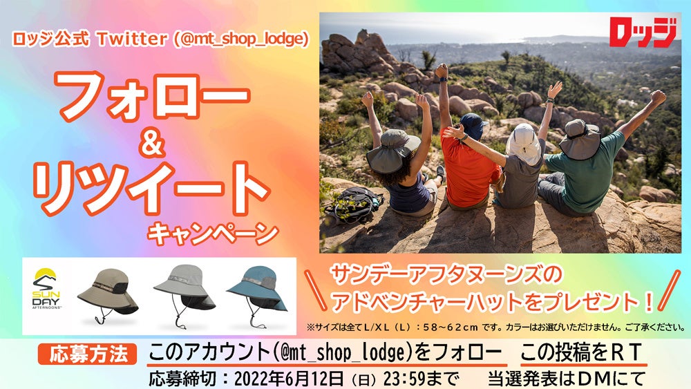 ゼット株式会社(本社/⼤阪市天王寺区、代表取締役社⻑/渡辺裕之)のグループ企業「⼭とアウトドア専⾨店ロッジ」は、ロッジ⼤阪店公式Twitterアカウント(https://twitter.com/mt_shop_lodge)にて、アメリカの帽⼦専⾨メーカー・サンデーアフタヌーンズのアドベンチャーハットが抽選で当たるTwitterフォロー&リツイートキャンペーンを開催中です。
