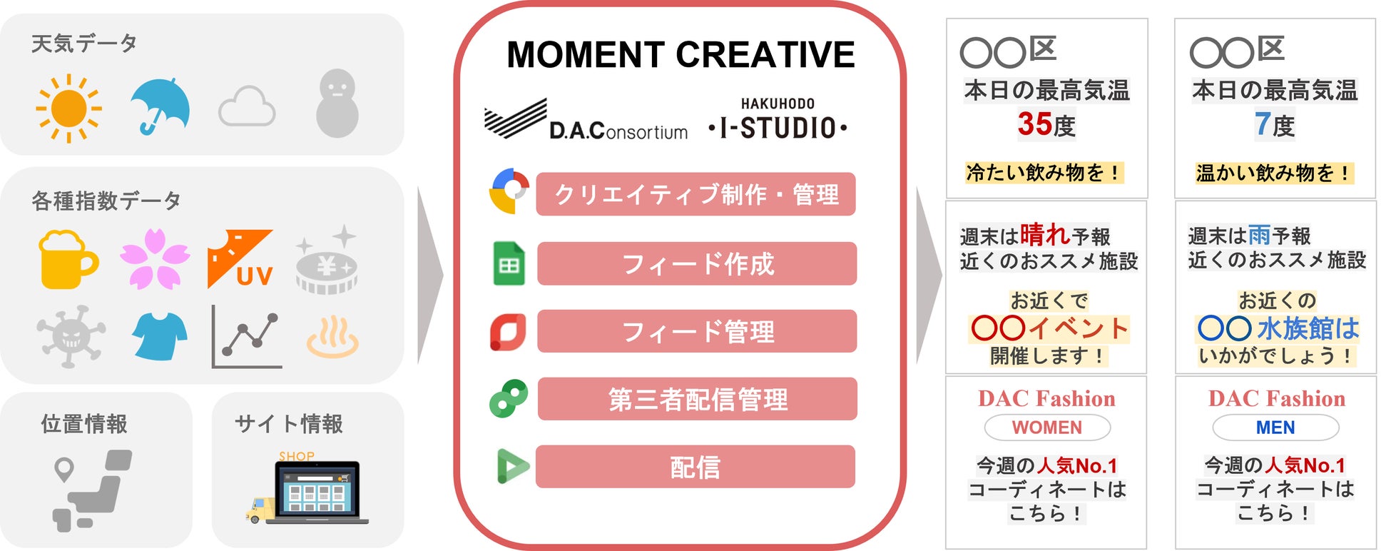 デジタル・アドバタイジング・コンソーシアム株式会社(本社:東京都渋谷区、代表取締役社長 執行役員CEO兼CCO:田中雄三、以下 DAC)と株式会社 博報堂アイ・スタジオ(本社:東京都千代田区、代表取締役社長 兼CEO 兼CCO:川又昌弘、以下 博報堂アイ・スタジオ)は、「Rich Creative Promotion Service(RCPS)」(※1)の第三弾メニューとして、外部データのAPIとGoogle マーケティング プラットフォーム のプロダクトを活用し、クッキーに依存せずに1to1の広告配信が可能な「MOMENT CREATIVE」の提供を開始します。天気情報や位置情報等の外部データや企業サイトのデータを活用することで、ユーザーを取り巻く環境に応じてモーメントを捉え、クリエイティブを出し分けることが可能となります。