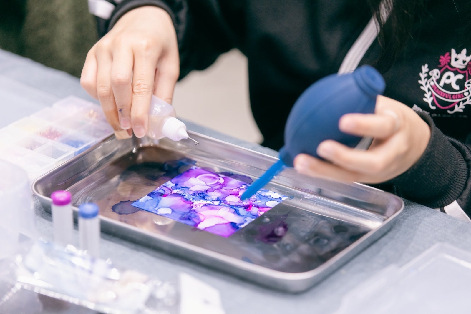36色から好きな色を選んで真っ白なキャンバスにのせ、アルコールと風で色を動かしてアートパネルをつくります。