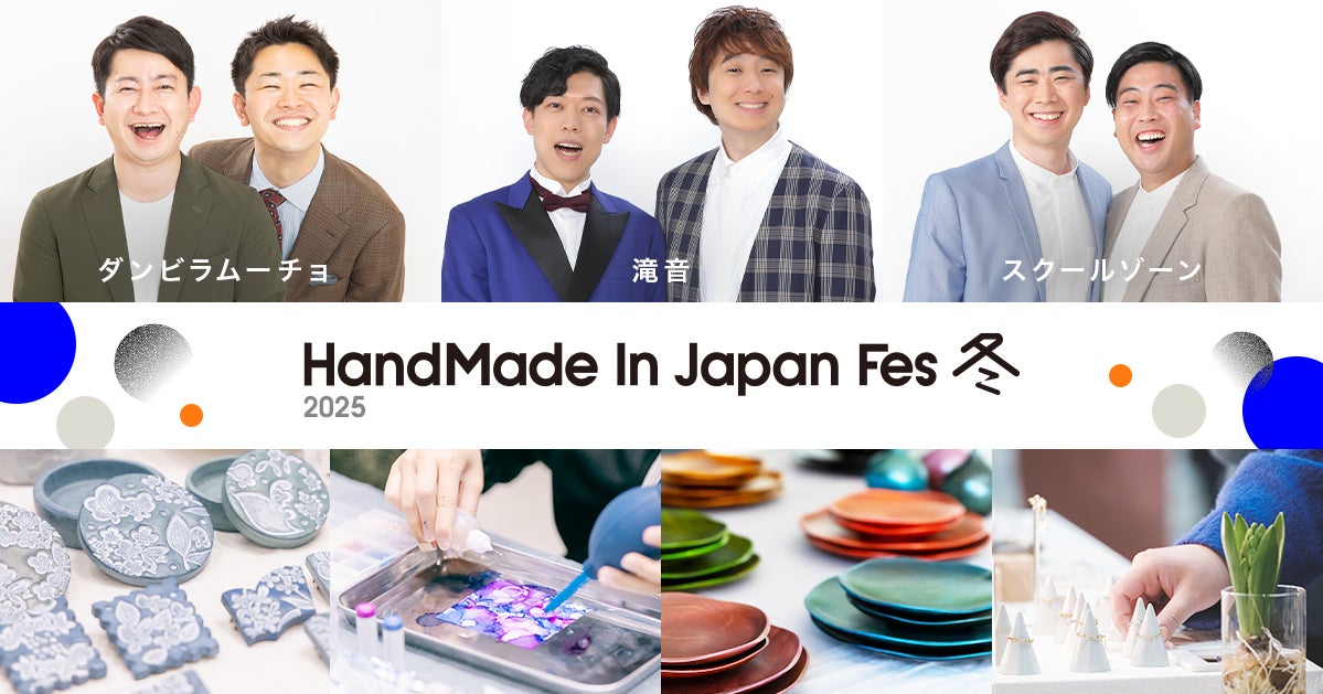 日本最大級・クリエイターの祭典「ハンドメイドインジャパンフェス冬(2025)」に、スペシャルコンテンツとして初のお笑いライブが登場します。毎年恒例の賞レースでも活躍したダンビラムーチョ、滝音、YouTubeやSNSでも人気のスクールゾーンの、吉本芸人3組の出演が決定。クリエイティビティにあふれる自由な発想で練り上げられた漫才やトークライブで、会場が笑いの渦に包まれるひと時をお届けします。