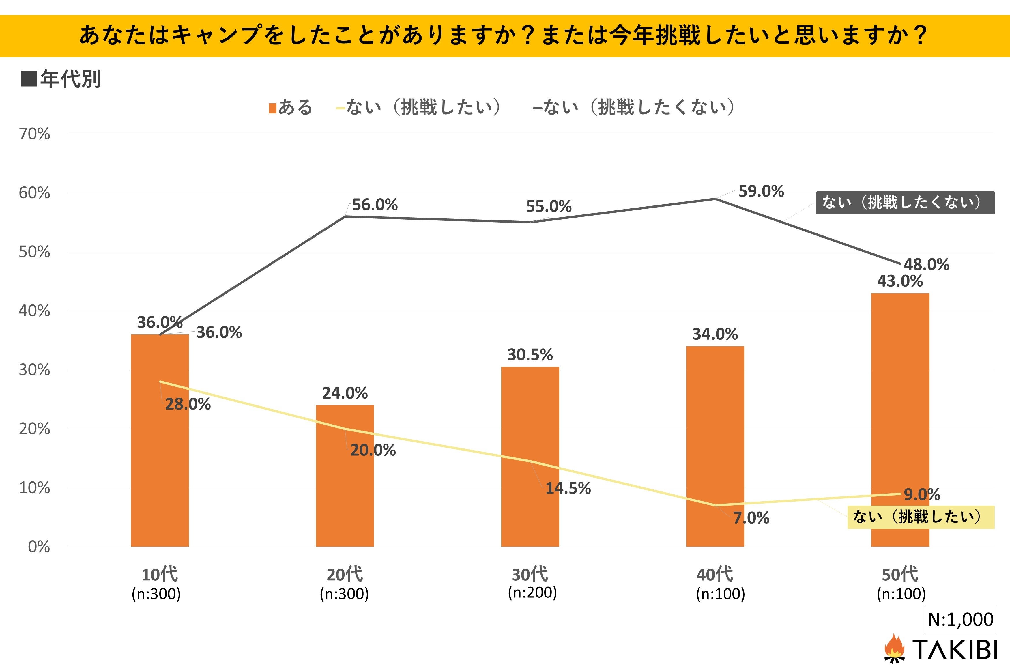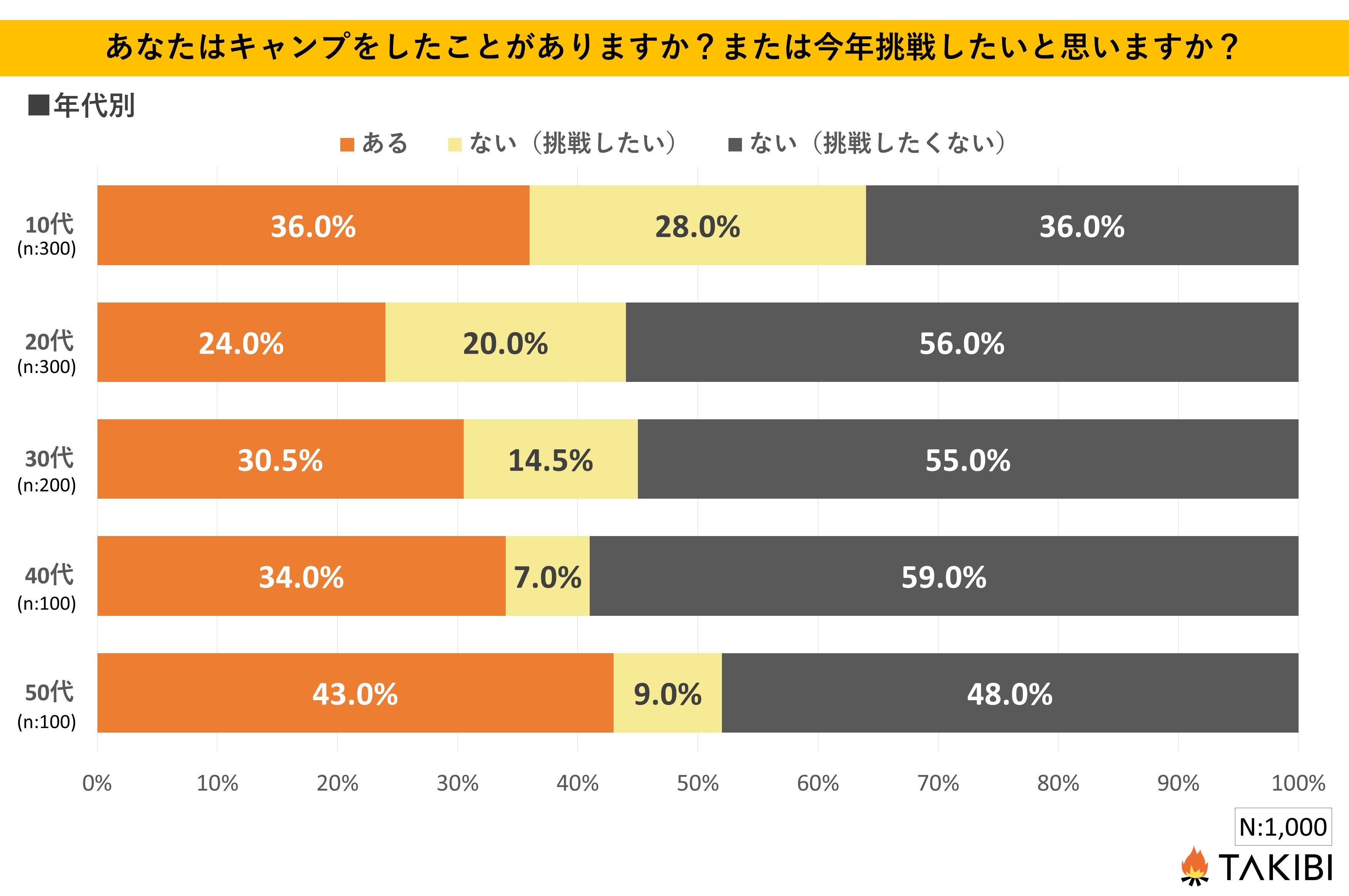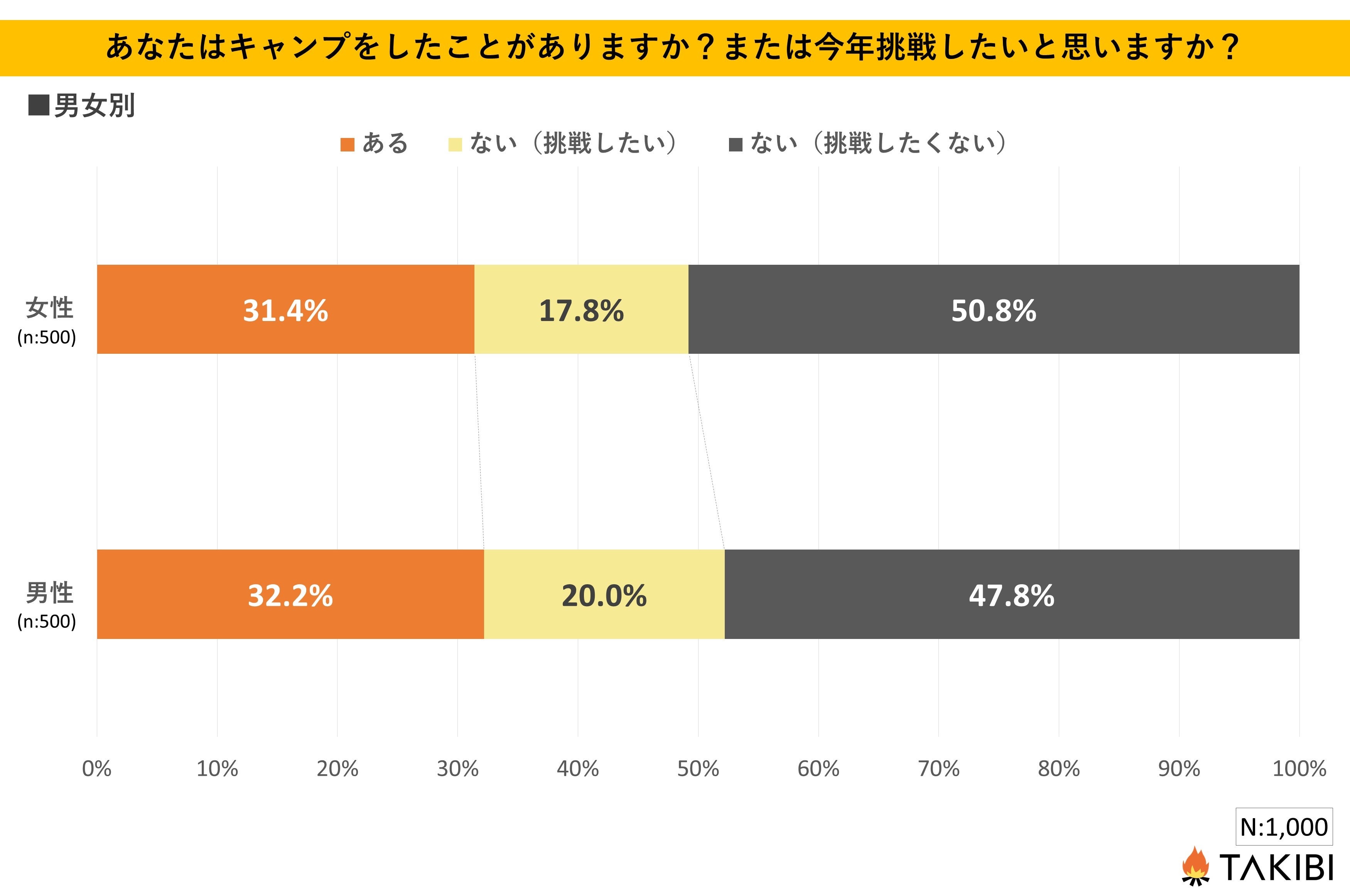 キャンプやグランピングを中心としたアウトドア総合情報サイト「TAKIBI」の運営をおこなう株式会社フォーイットは、全国の10代~50代までの男女1,000人を対象にキャンプ関するアンケートを実施し、男女別・年代別等の特徴についてまとめました。