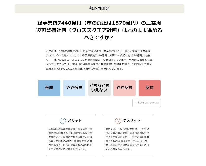 今回の市長選の「争点」として挙げられている三宮周辺整備や人口減少対策など幅広い分野の設問になりますが、全ての質問に概要を説明する「解説文」と「メリット」「デメリット」を記載することで、利用者の判断材料をご提供します。