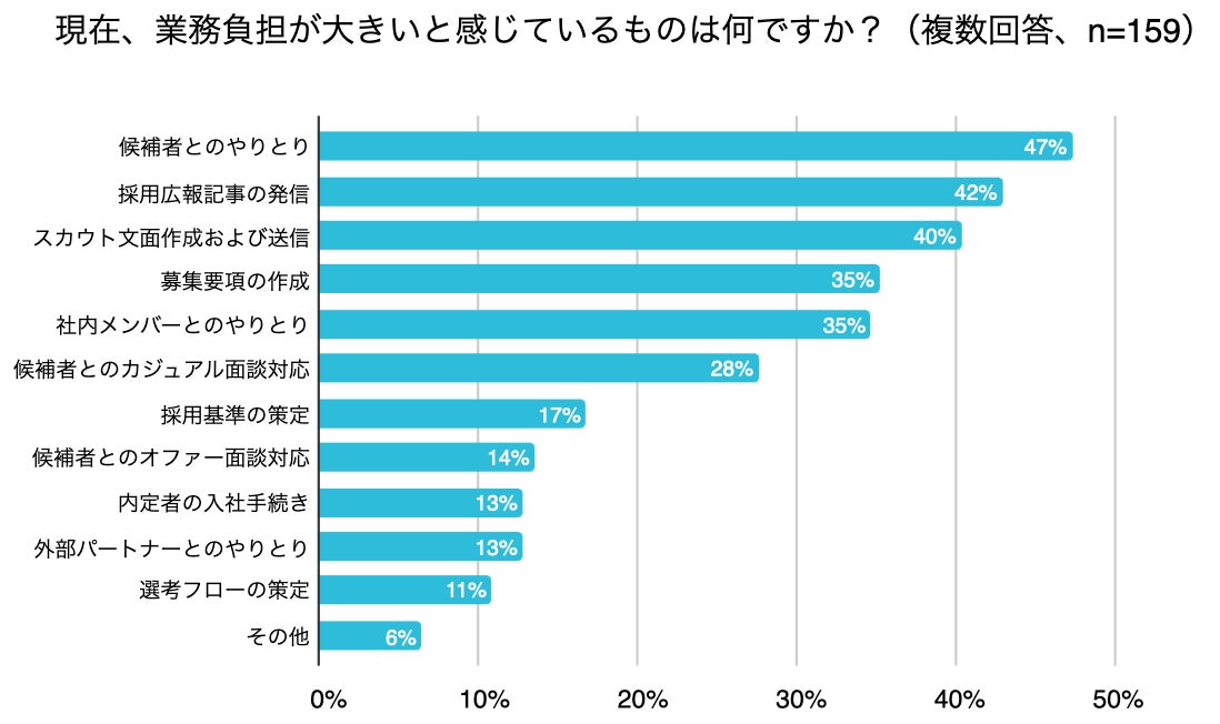 採用活動の業務において負担に感じているものとして「候補者とのやりとり(メッセージ送信や日程調整、結果通知など)」が47%で最も多く、次いで「採用広報記事の発信」が42%、「スカウト文面作成および送信」が40%という結果となりました。