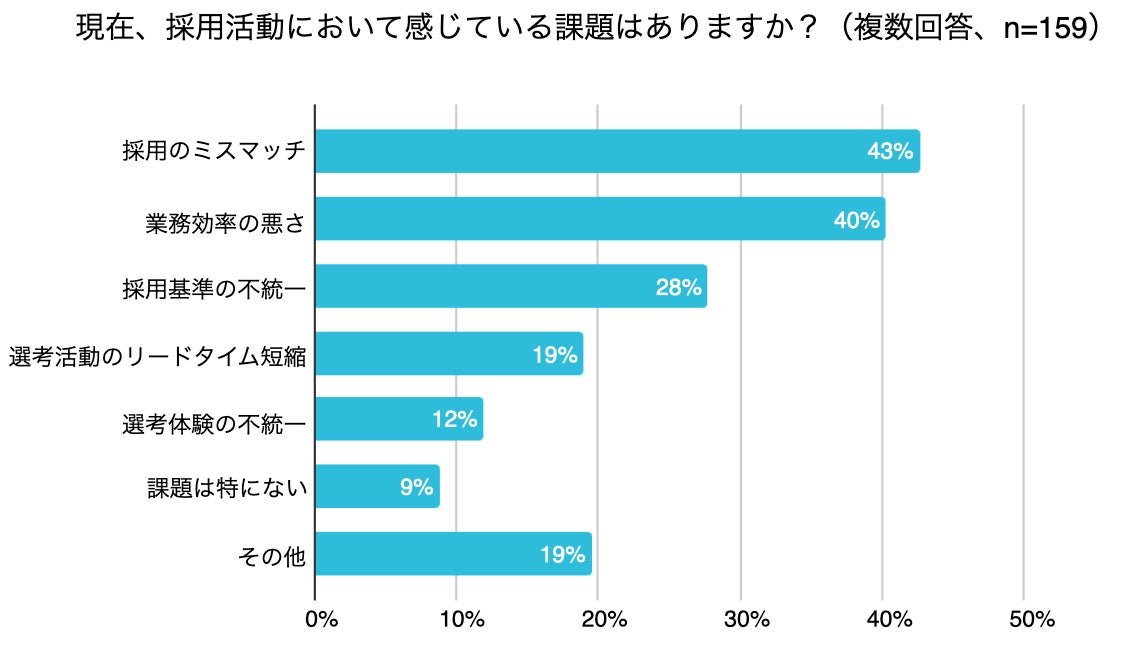 実際に、採用担当者に採用活動において感じている課題を聞いたところ「採用のミスマッチ(内定辞退や早期離職)」が43%で最も多い結果となっています。