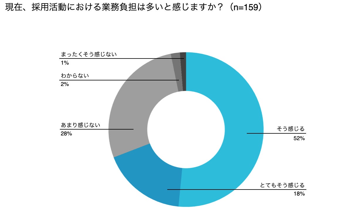 採用活動において、担当者の業務負担が多い傾向にあります。当社が今年の9月に実施した調査では、採用担当者のうち70%が「採用活動における業務負担が多いと感じている(とてもそう感じる+そう感じる)」と回答しました。