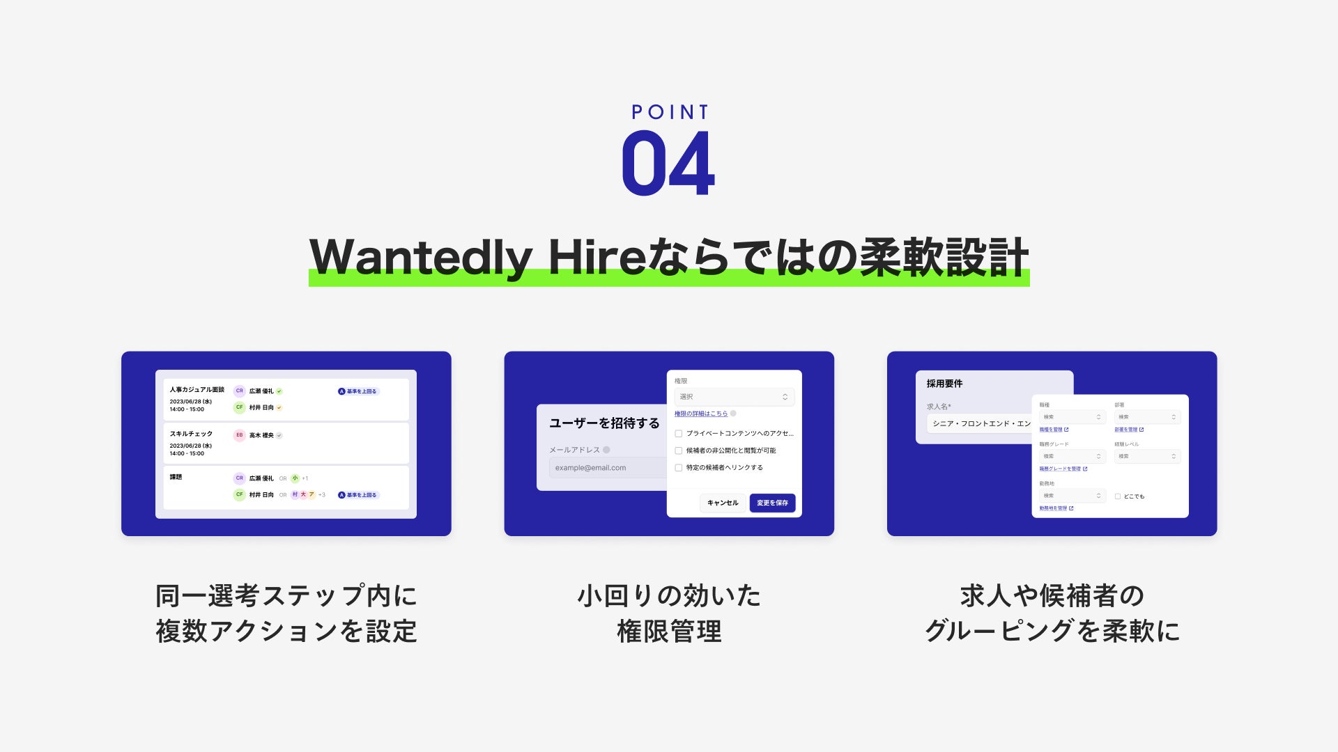 Wantedly Hireには、現代の採用シーンに求められる「速さ、確実性、柔軟性」の実現に役立つ機能を搭載しています。各機能の詳細な説明はサービスページをご確認ください。