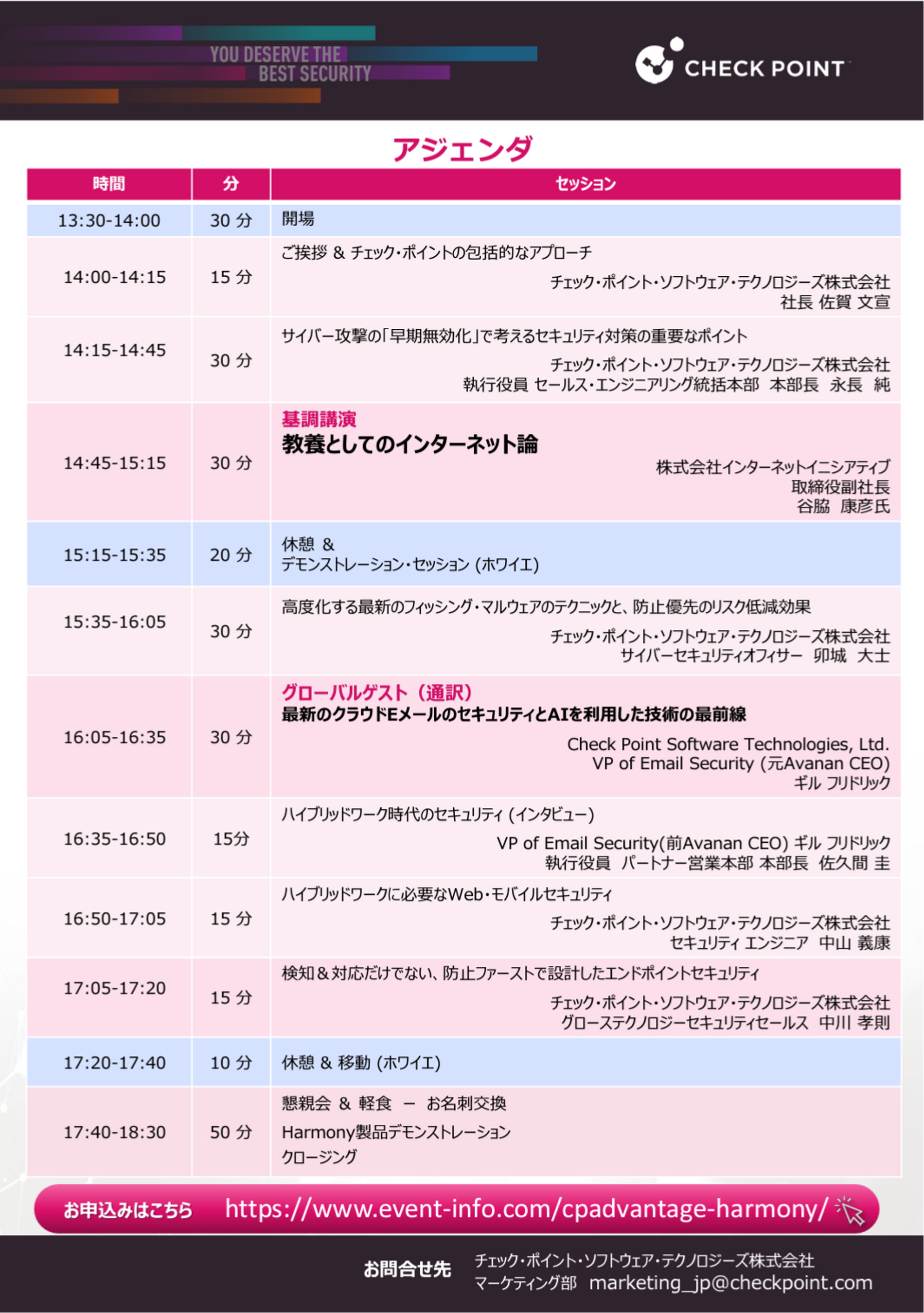 複雑化・多様化するセキュリティ要件に答えるチェック・ポイントの新しいソリューションのご紹介と、そのイノベーションを支えてきた堅牢なリサーチチームCPRの知見を合わせた、チェック・ポイントならではの充実したプログラムとなっています。皆様のご参加を心よりお待ち申し上げております。