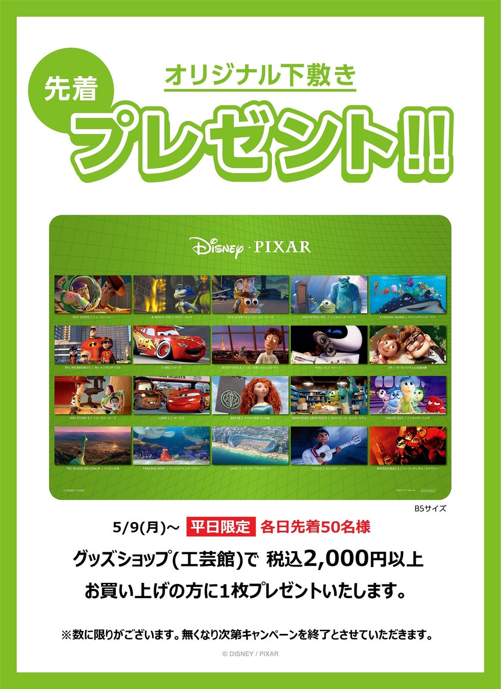 平日、グッズショップ(工芸館)で税込2,000円以上お買い上げの方に、オリジナルPIXAR下敷き(非売品)をプレゼント!