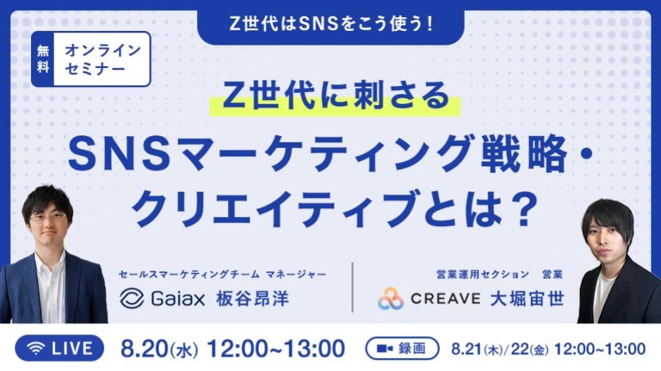 クリエイターとの共創を通じて企業のマーケティング課題を解決する、株式会社CREAVE(本社:東京都千代田区、代表取締役社長:中村真奈、以下 CREAVE)は、8月20日(水)にSNSマーケティング担当者様に向けた『Z世代はSNSをこう使う!Z世代に刺さるSNSマーケティング戦略・クリエイティブとは?』セミナーを開催いたします。