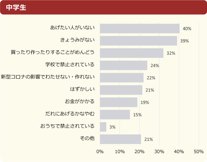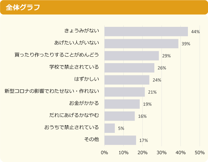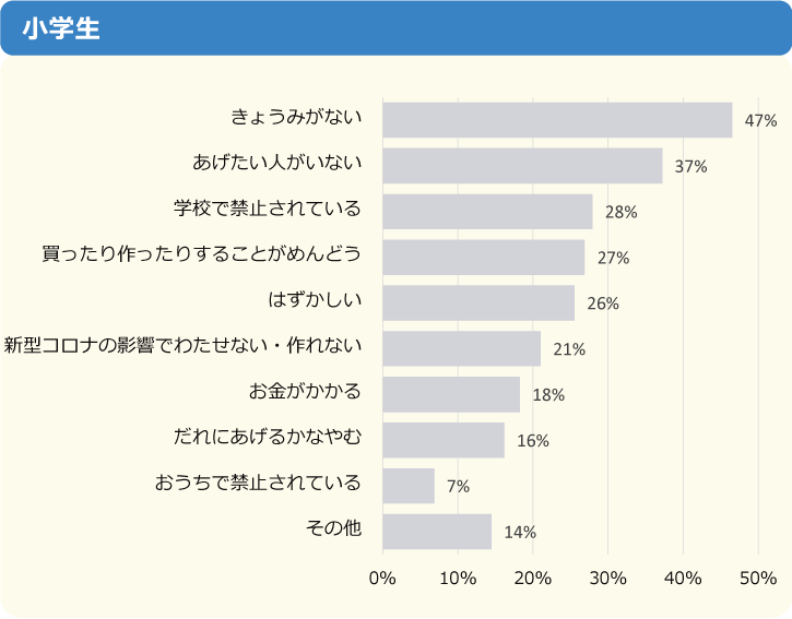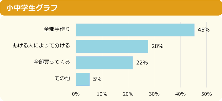 また、手作りをするか市販のものを購入するのかを聞いた質問では「全部手作り」する人が45%にのぼり、2位の「あげる人によって分ける」と回答した28%と合わせると、手作りする人は7割を超えることがわかりました。