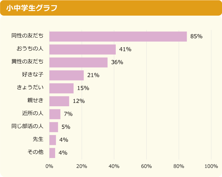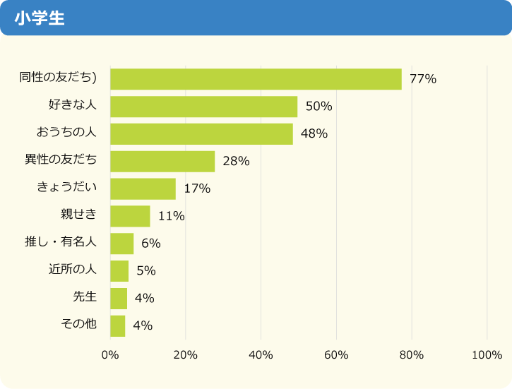 今年のバレンタインデーにチョコやお菓子をあげると答えた人は全体の75%となりました。誰にあげるつもりなのかについては、「同性の友だち」が全体の78%と1番多く、次に「好きな人」「おうちの人」と続きました。