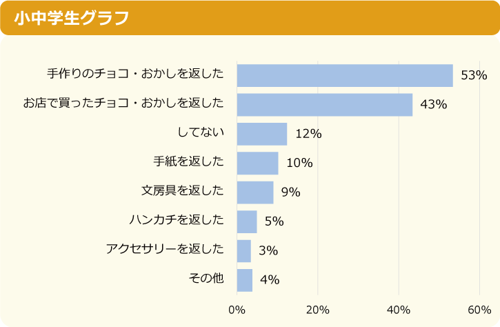 その他には「その場でお互いに交換した」「友チョコでみんなと交換」など、そもそも交換したので後日のお返しはしないといった意見もありました。