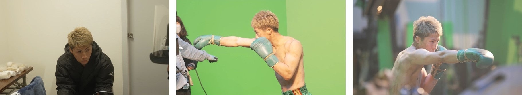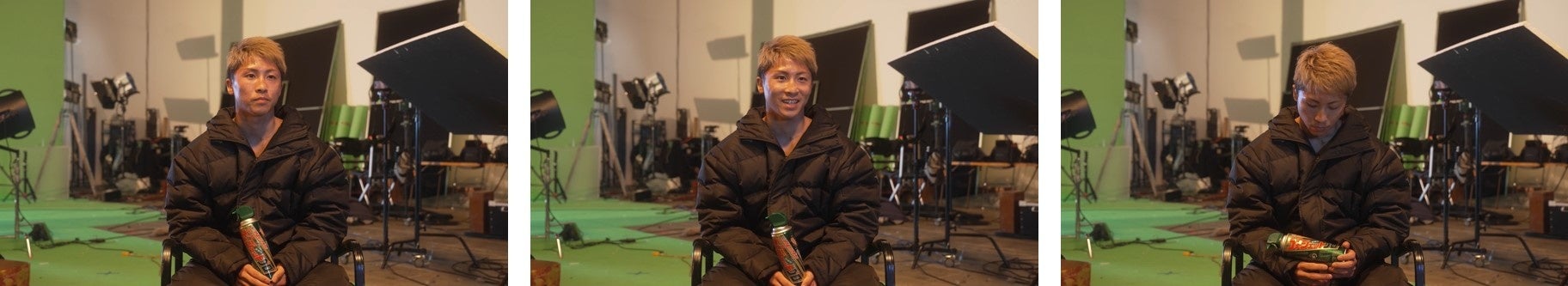 撮影当日、商品や今回のCM撮影についての説明を真剣な表情で聞く井上選手。テーマカラーであるグリーンのボクシンググローブをはめ、試合さながらに気合を入れたシャドーを見せて挑みます。撮影では、スタッフが持つミットに、キレ味鋭いパンチを打ち込む姿を披露していただきました。