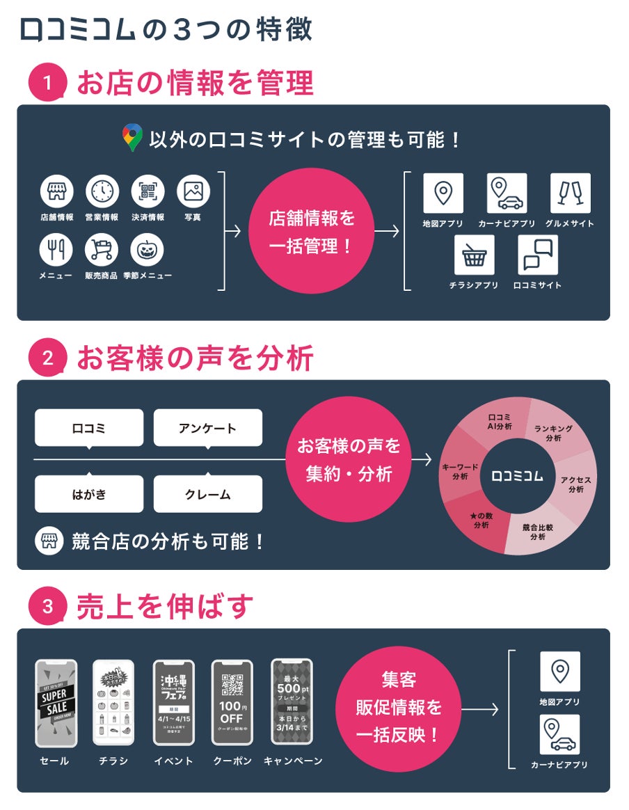 口コミコムは、Googleマップをはじめとした地図アプリや口コミサイトでの店舗情報を整理し一括更新できると同時に、お客様の口コミ分析、クーポンの配信まで行うことで、国内外の口コミサイトを”もっと”売上に変える「口コミサイトの一括管理ツール」です。また、導入頂いた店舗の口コミ数を増やすことにも貢献しておりますので、よりお客様の声を大切にする店舗運営が可能となります。