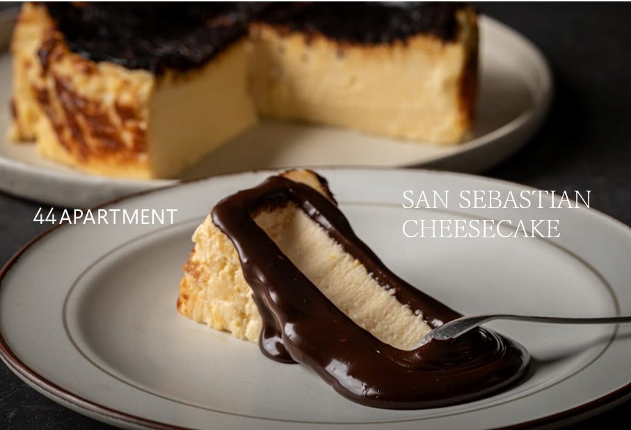 表面は香ばしいのに中はとろっとろの半生状態。濃厚なチーズの風味と、焼き目の香ばしさが絶妙なバランス。上からオレンジリキュールの香りが残るチョコレートソースをたっぷりかけたら、なんとも贅沢なバレンタインのご褒美スイーツにぴったり。何度も試作を重ねてベストな配合と焼き加減を生み出した、一度食べたら忘れられない44APARTMENTのサンセバスチャンチーズケーキ。