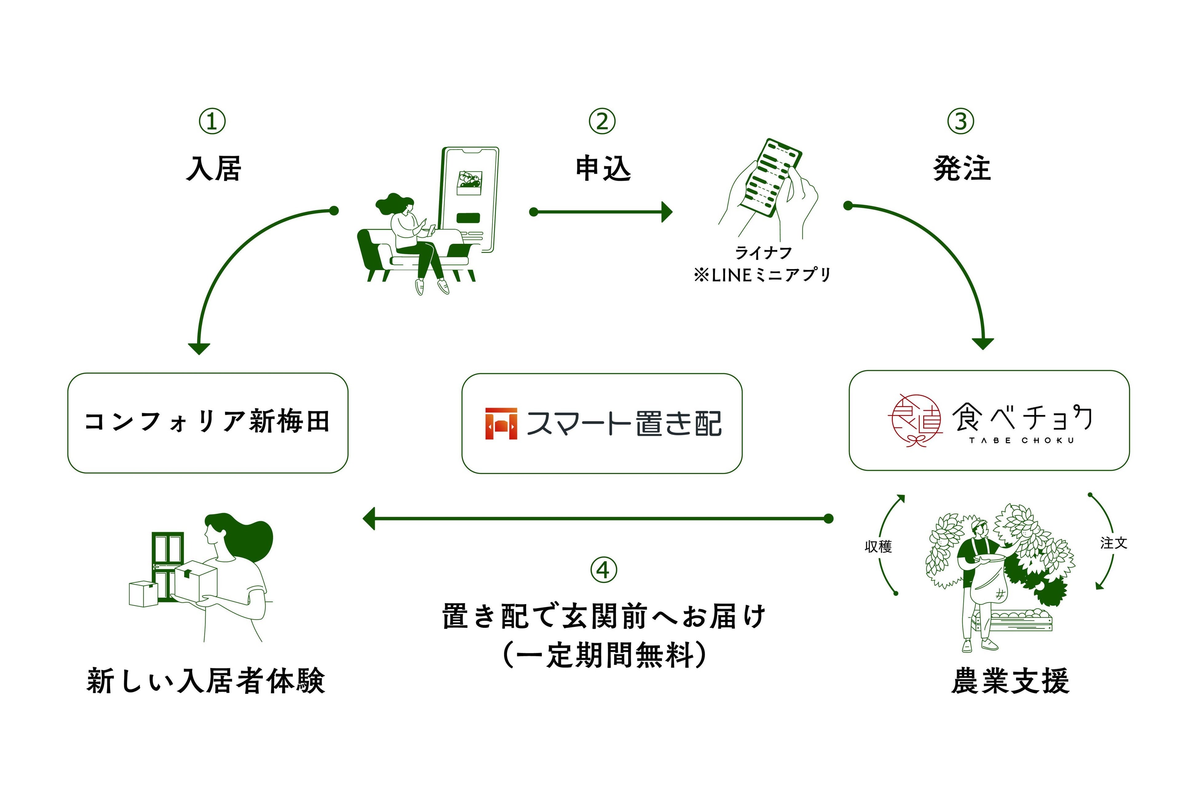 食べチョクが「産直食材付き物件」を提供開始。東急不動産・ライナフと協業し、野菜や果物を無料で定期お届け。生産者の経営安定や再配達削減に貢献。