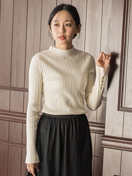 ドロワットで大人気のソリストヒートリブニットが新色カラーを加えて今年も登場。高すぎない絶妙なハイネックが好評のポイントです。ランダムなピッチのリブ編地で、ベーシックでもおしゃれに着こなせます。吸湿発熱素材のあったか機能素材を使用した、衣服内の湿度を保温性に変化させる機能で、柔らかくてもっちりとした肌触りの良い素材です。伸縮性があり、ぴたっとし過ぎないシルエットで窮屈にならず楽に着用していただけます。コートやワンピースなどのインナーとしても着回し易く、持っておくと便利な必ず使える一枚です。袖のメタル釦がコーディネートのさりげないポイントに。