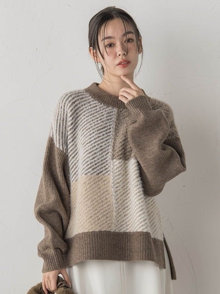 バイアス柄のジャカード編みをブロッキングデザインで仕上げた目を引く1枚。さっと着るだけでコーディネイトの主役になるニットです。ニットらしいざっくりとした編地でゆとりのあるボクシーラインに仕上げることで気になる体のラインをカバー。コンパクトなクルーネックなので、首元をすっきりと見せることができ、インナーにハイネックカットソーなどを重ねてレイヤードコーディネイトも楽しめます。